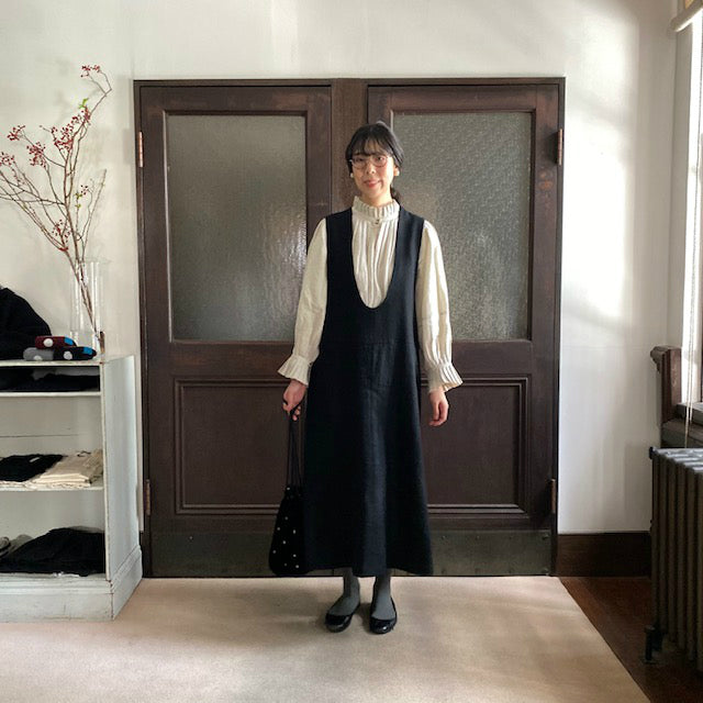 美しいブラウスと合わせると、カジュアルな印象のジャンバースカートもピンと背筋が伸びるよう。