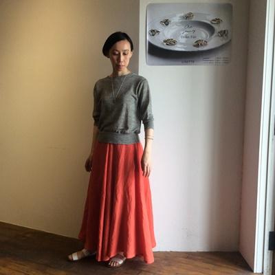 色とシルエットが綺麗なスカートだからさらっとリネンニットに合わせて。細いラインのaoのブレスレットだけ重ねづけ。