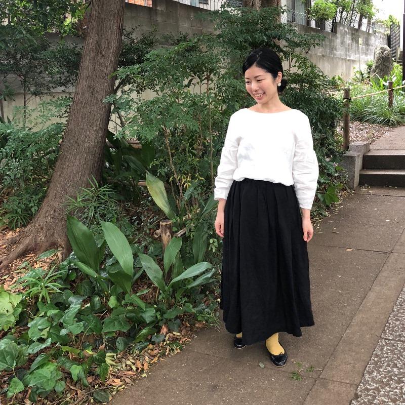 新作のリネンスカートは一枚でも透けず安心感のある一枚。表情のあるヘリンボーンの生地がお気に入り。