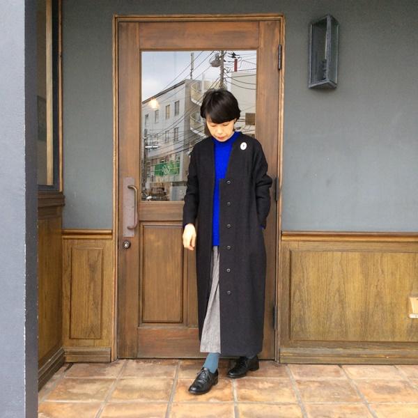 珍しいデザインのワンピースコート。今日は鮮やかなブルーのニットを合わせたくて、付け襟を外してコートとして着てみました。