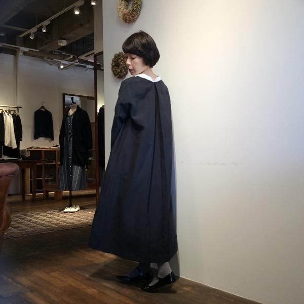 一見シンプルな黒のワンピースですが、白い衿や後ろに入った開きが印象的。