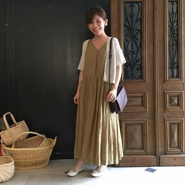 細かいギャザーと少し深めのVネックがお気に入りのリネンワンピース。