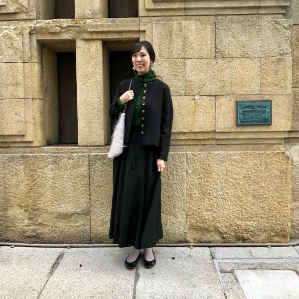 黒いコーディネイトの中にジャケットの金ボタンがアクセントになります。