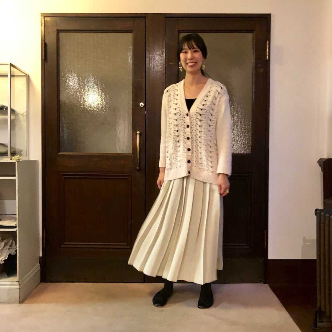 インナーや小物はカーディガンのボタンと合わせて黒できりりと。