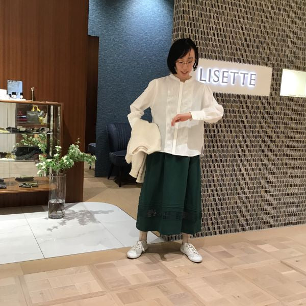 暖かくなったら素足で着たいけどまだ寒いから白いタイツで。袖口に3つ並んだくるみボタンがさりげなくポイントになってます。