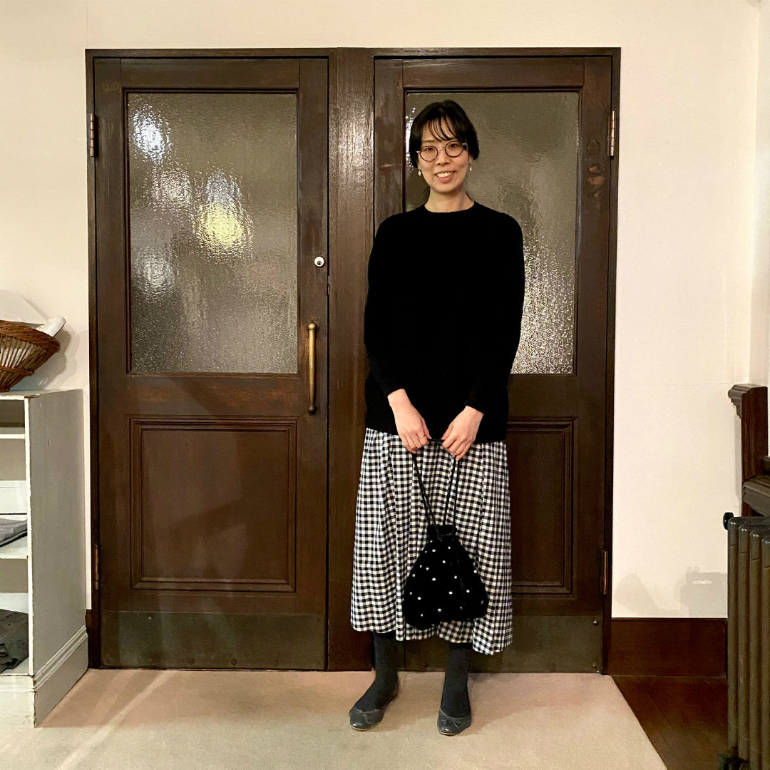 ギンガムチェックとドットの柄合わせも色味を抑えるとすっと馴染んでくれます。