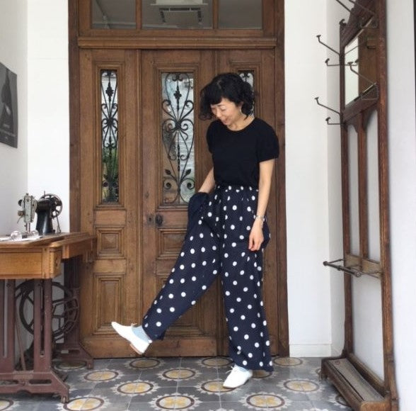 水玉のパンツにポンポン付きの靴下を合わせて。