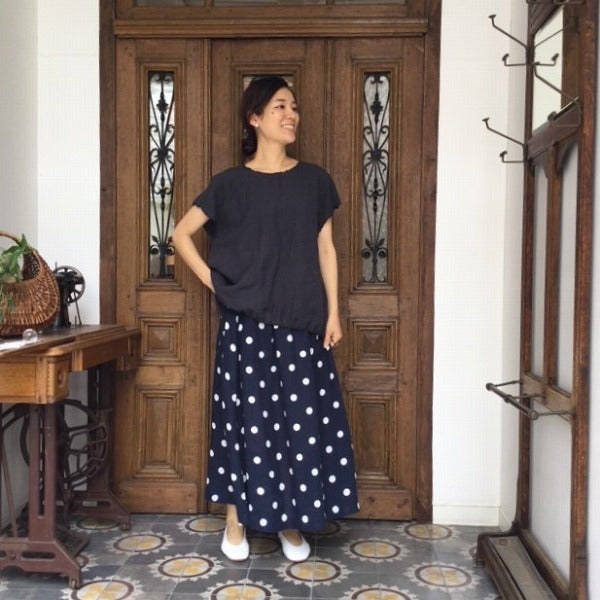 水玉柄のスカートに小さなマルが連なったレースをあしらったブラウスを選びました。水玉柄は着ているだけで涼やかな気分に。