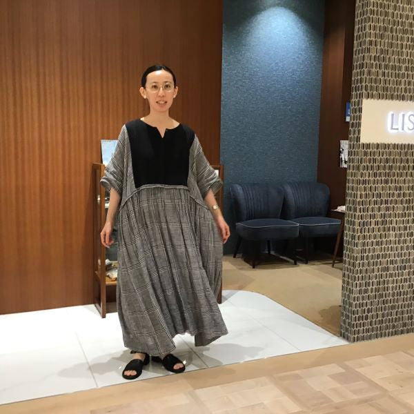 蒸し暑い日は締め付けがないワンピースと風の抜けるインナーパンツを着たい。ボタンを一つ開け襟元を少し抜くとよりリラックスした感じになり、チェック柄の布地もさらに表情が出てきます。