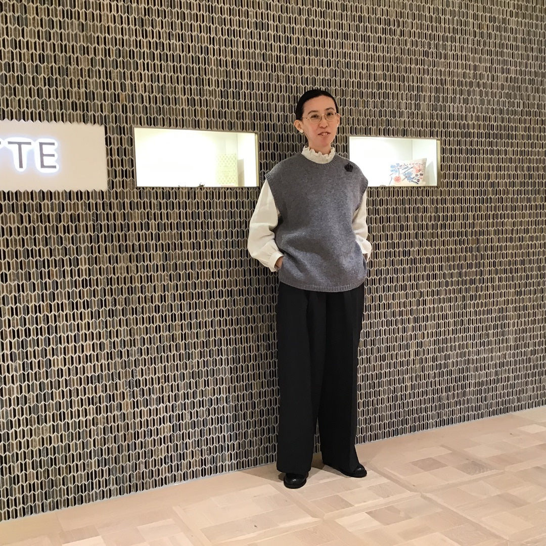 室内でも温度調節がしやすいベストは私の秋冬定番アイテム。ハンサムな雰囲気のなかに襟元のスモッキングでさりげなく可愛らしさをプラスして。
