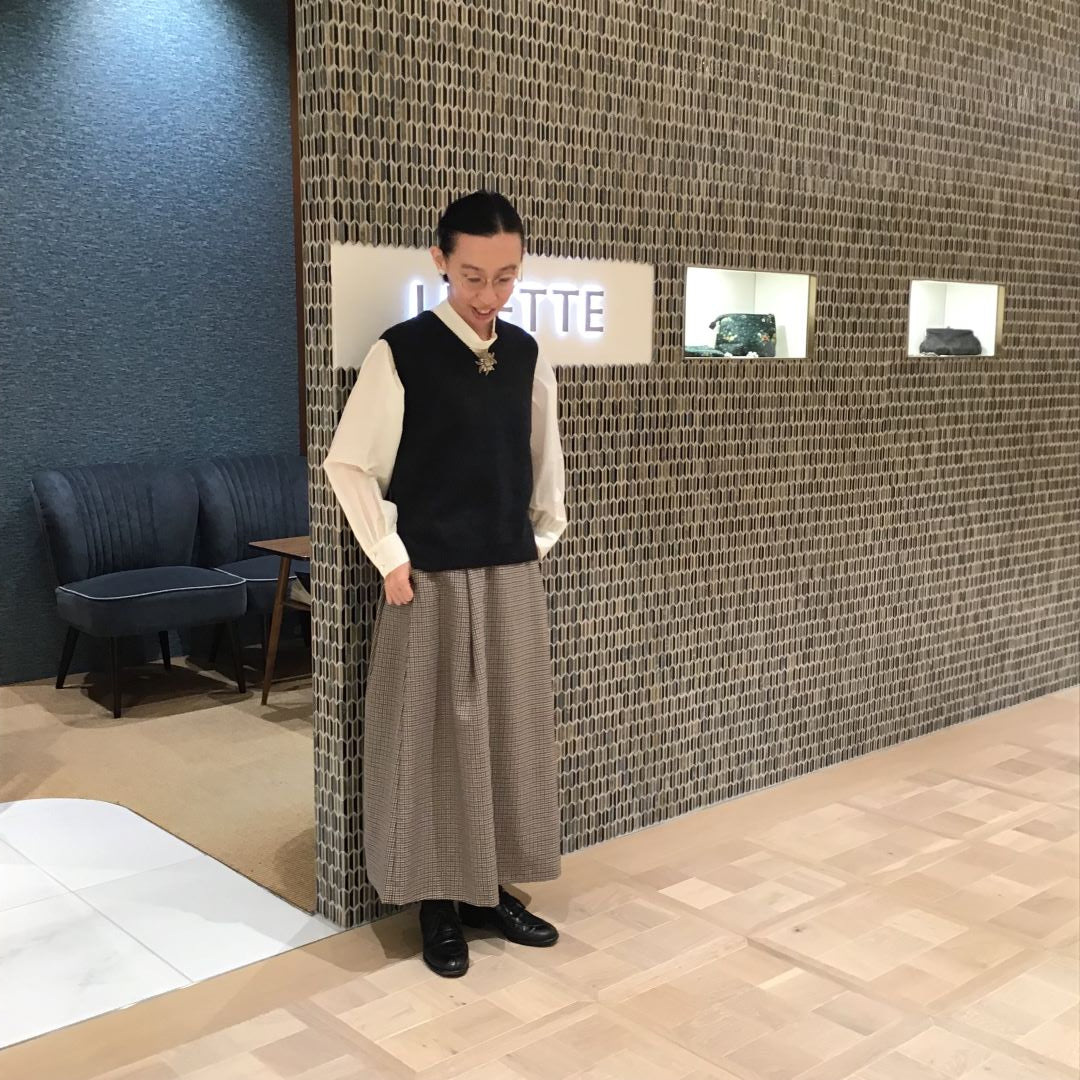 ベストにブローチ、チェックスカートと古い映画に出てくる先生みたいな格好。白いシャツではなく、上品な透け感のあるベージュのブラウスであわせたことがポイント。