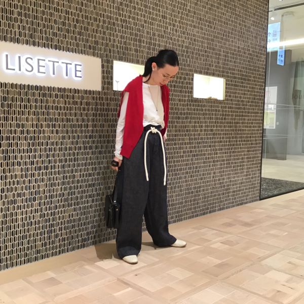 トリコロールな色合わせ。パンツの太いロープは不思議とウエストに収まりがよく夏に向けてたくさん出番がありそう。