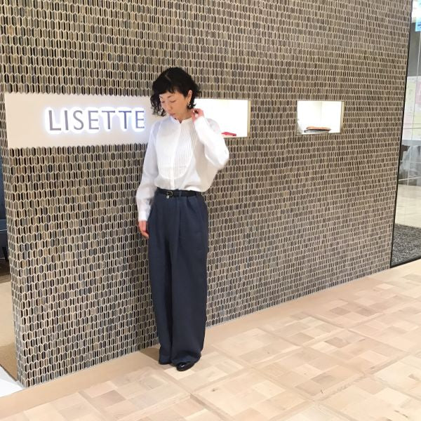 ピンッとハリのある真っ白なピンタックブラウスに、艶のあるリネン地のパンツ。リゼッタには様々なリネンの洋服がありますが、背筋がスッとのびるような生地が好きです。