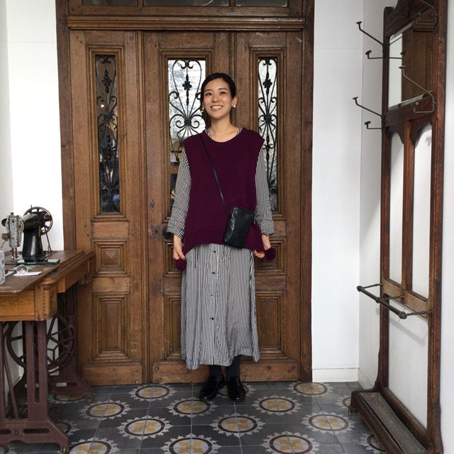 プリュヌは深い紫で、紫を普段着ない私でも取り入れやすいです。冬はコートとの重ね着でアクセントカラーとして使えそうです。早く涼しくなってほしいな~と思う今日この頃です。