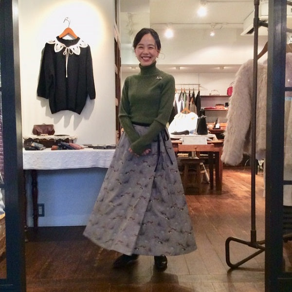 うさぎ柄のシンプルな巻きスカートと合わせて、落ち着いた色合いの秋らしいコーディネイトに!