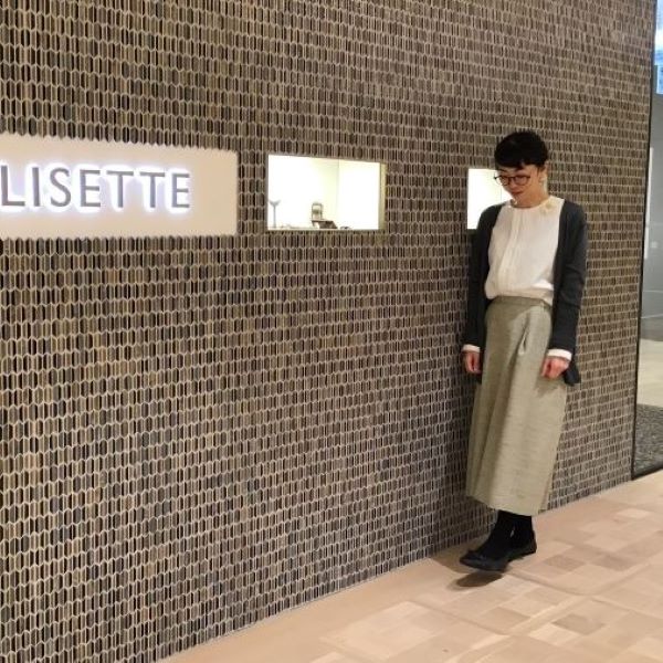 シルクカーディガンの艶、スカート美しい織りの表情。