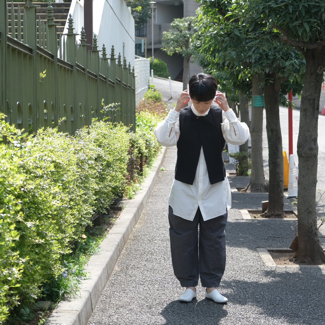 ただいま受注会開催中のSALUÉのジレ。一枚あると、手持ちの洋服に変化が出せてコーディネートが楽しくなります。今日はthe lastflower of the afternoonのロング丈ブラウスに合わせて。