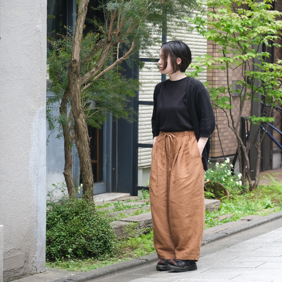 自分でパターンを引いて、すぼまった裾がポイントのサーカスパンツをつくりました。選んだ生地は、リパリストーンウォッシュのコニャック。中厚地なので透け感がなく、一年中履いています。