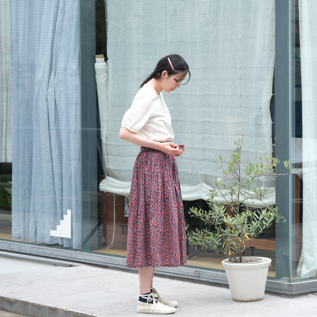 リバティで仕立てたギャザーたっぷりのスカート。上はシンプルに、スカートが主役になるようにコーディネートして、一年中着ているお気に入りです。