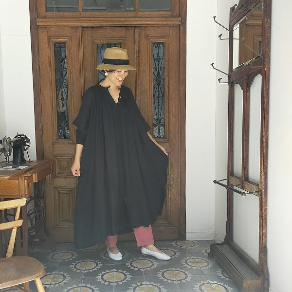 今日は襟元を広めに開け、他のボタンは閉じてワンピースとしてコーディネート。色々な着方ができるワンピースは便利ですね!