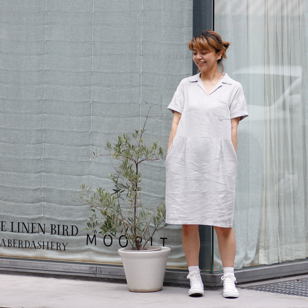 今は取り扱い終了してしまったMerchant & MillsのFactory Dressというパターンでつくったワンピース。1920年代の働く女性からインスピレーションを受けたデザインで、とても動きやすいです。サリナラウンダードは厚みがあるけれど、夏でも涼しく着られます。
