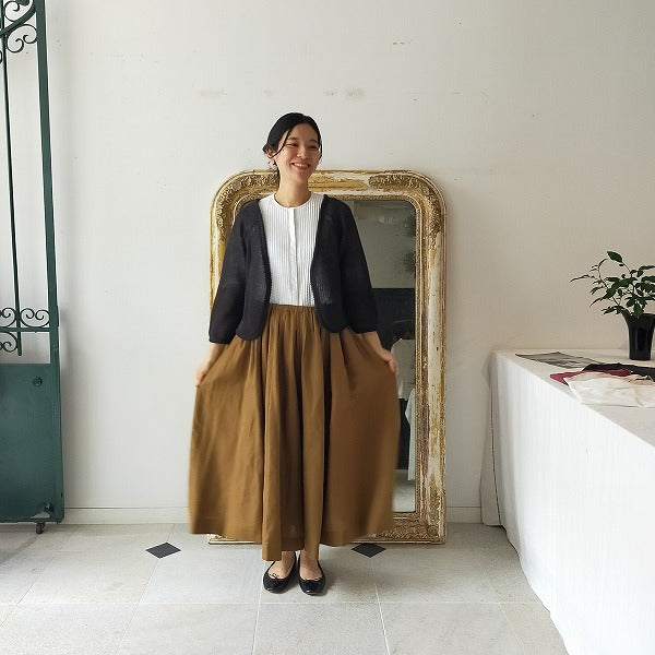 シワになりにくいリネン100%のブラウスは重ね着するとぐっとイメージが変わります。秋の始まりはこんな風にレイヤードスタイルもおすすめですよ!
