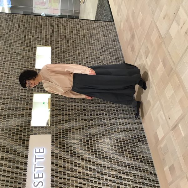控えめなコクーンシルエット、ドレープの陰影が美しい生地、ウエスト後ろだけゴムの楽ちんさ・・・履いて立体的に見たことで、より心にぐっときたスカートです。