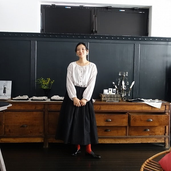 ここのところ気温が下がって過ごしやすい日が続いていますね!長袖のブラウスが肌心地よいです。ブラウス<ジェイミー>は生地の凹凸の表情が面白い一着。ブラウスの柄“赤“をアクセントに靴下もビビットカラーを選びました。