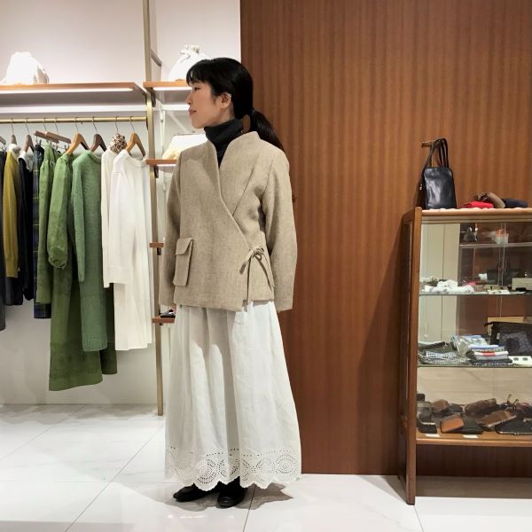 ウールリネンのジャケットは、ぴったり結んだときのリボンがお気に入り。