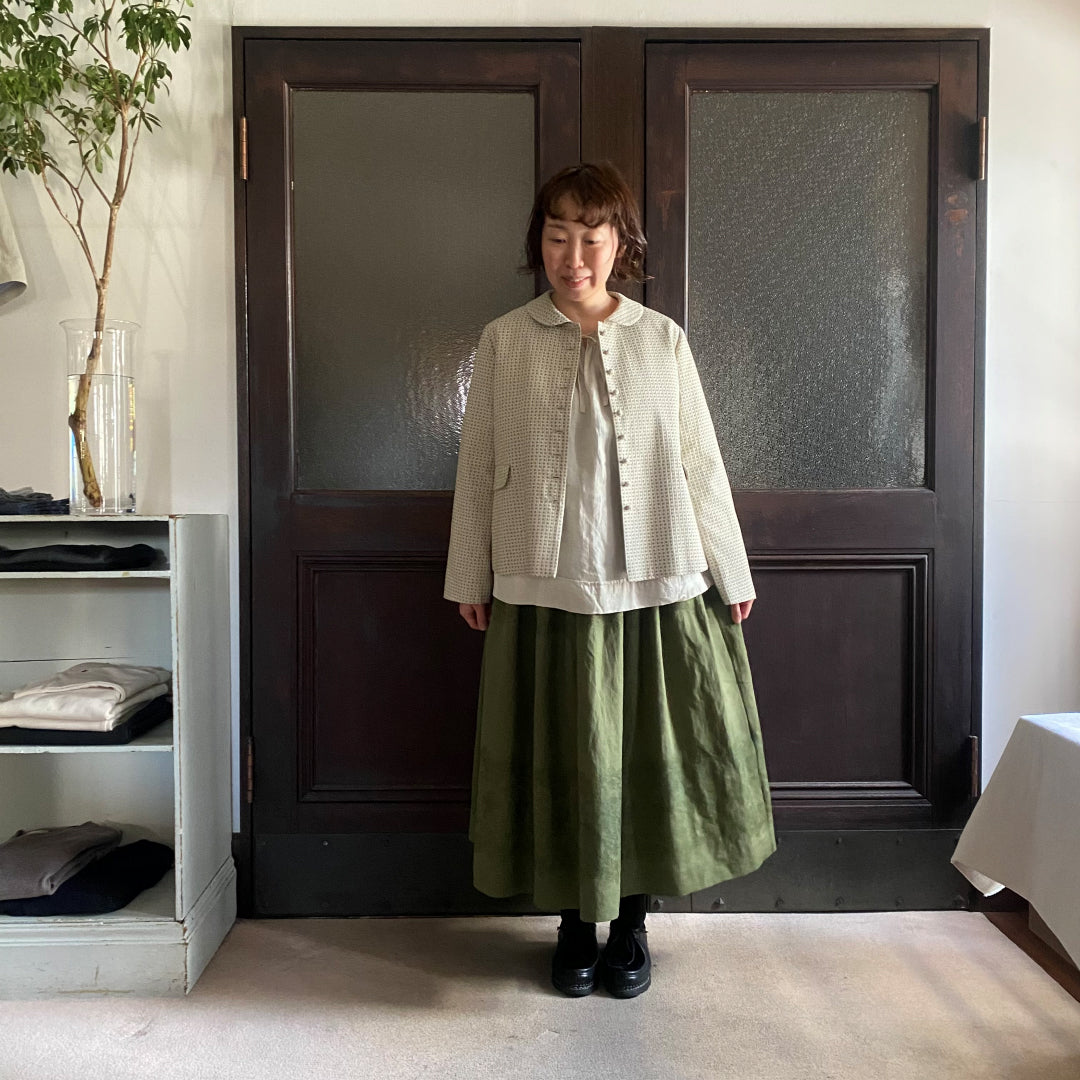 ブラウスに小花柄のジャケットを合わせて、緑のコーディネイト。
