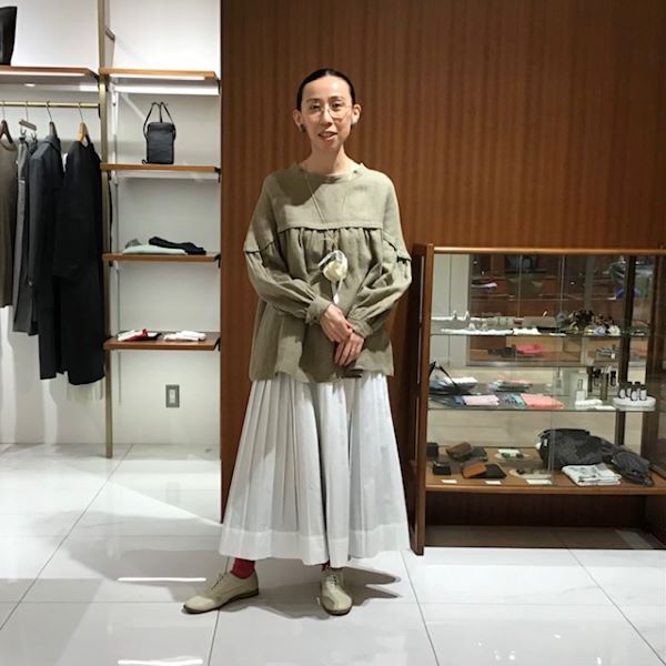 ゆったりとしたサイズ感で着心地のよいブラウス。目を引くディテールポイントが随所にあって装いの主役になります。モクレンのコサージュは手持ちのチェーンに通してペンダントトップとしても愛用しています。