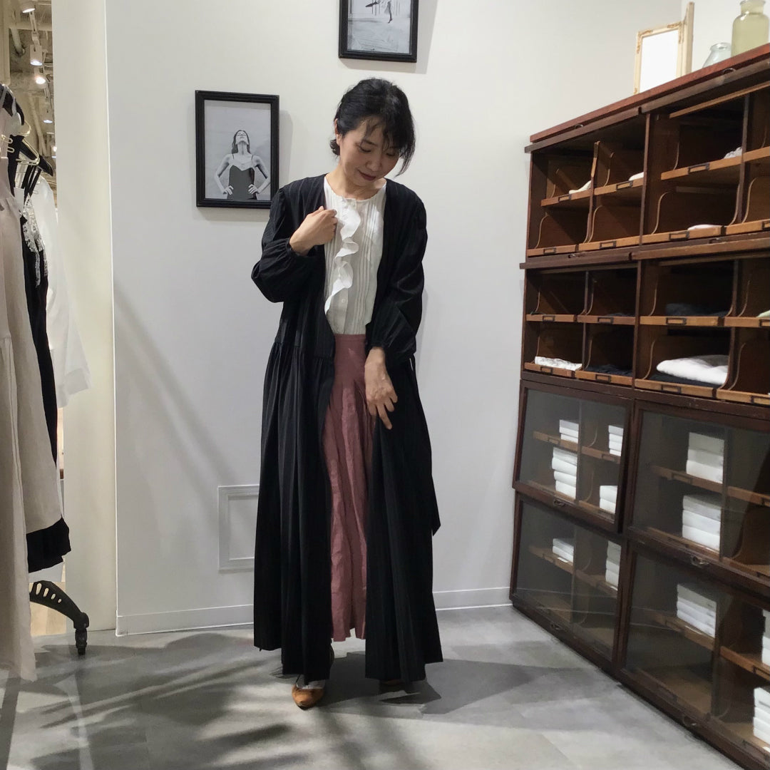 青みがかった大人ピンクのスカートにカシュクールワンピースのビゼーを軽く羽織ってコーディネートしてみました。