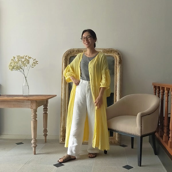 身に着けている人はもちろん、周りまで明るい気持ちにさせてくれる“ジャスマン色”のワンピースは夏のリゾートにもぴったりな一着。