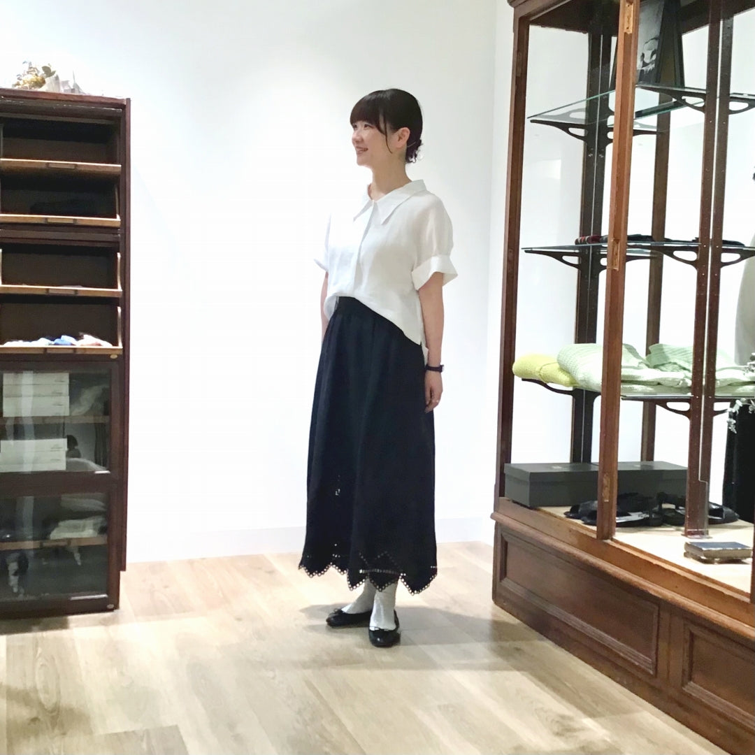 シンプルなモノトーンコーデにすると、ブラウスのシルエットやスカートのレースがより引き立つような気がします。