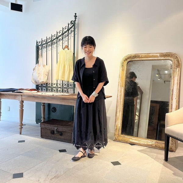前開きブラウスを羽織ってラフな印象に。
