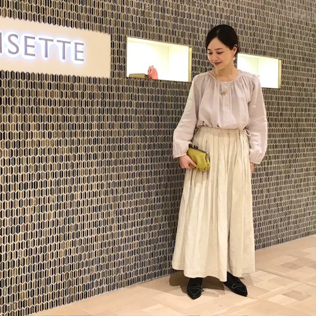 肩のギャザーが繊細に揺れて、スカートとの優しい色合わせに春が待ち遠しくなります。