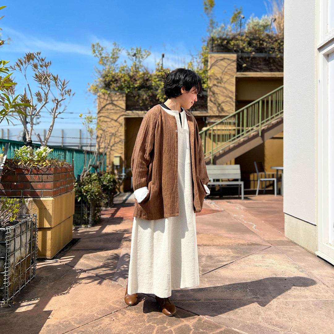 ゆったりとしたワンピースとノーカラーのジャケットでリラックススタイルです。