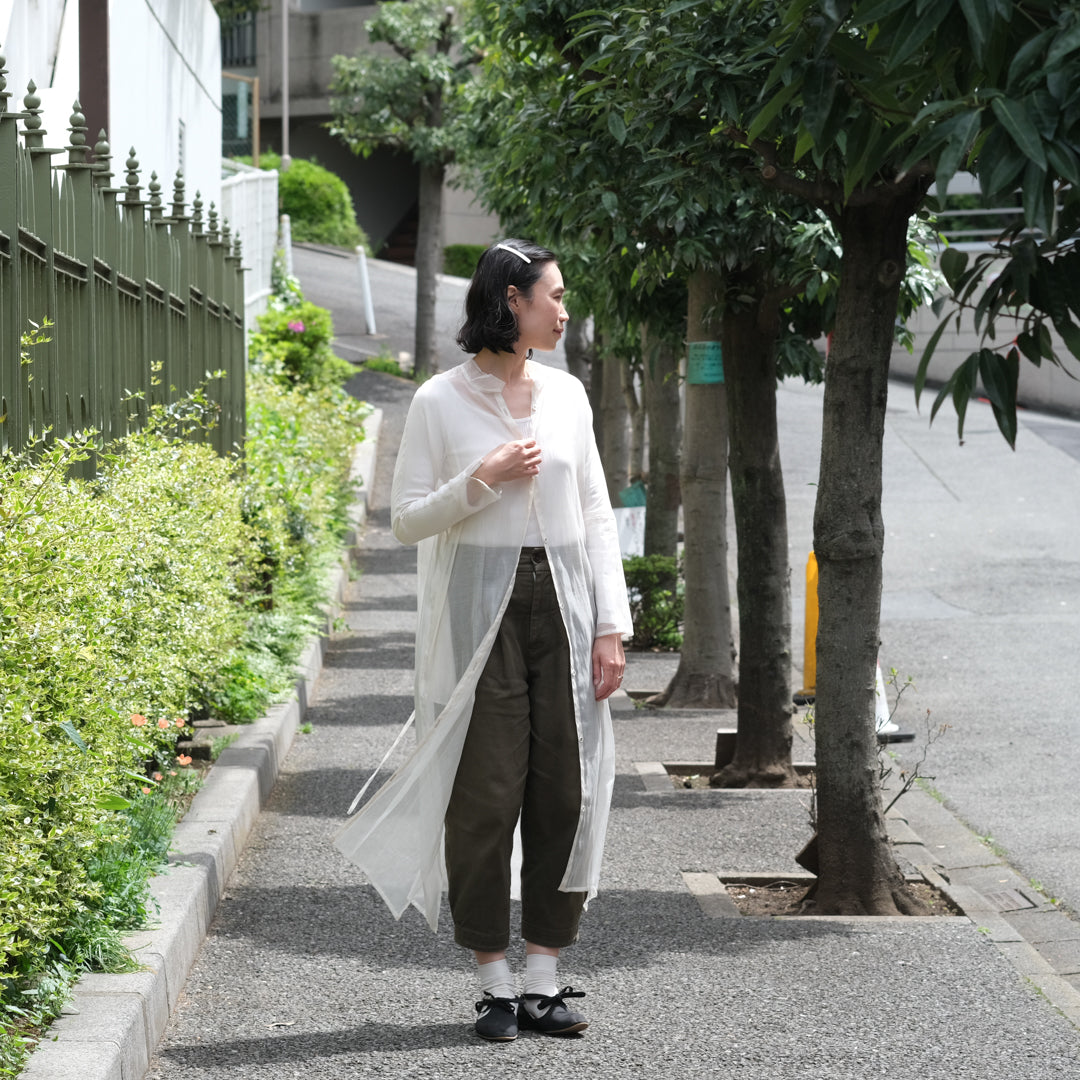 今日は初夏のように暑いですね。シルクコットンの透け感のあるワンピースを、甘くなり過ぎないようにカットソーやミリタリーパンツと合わせて。これからの季節、羽織りとして重宝する一枚です。
