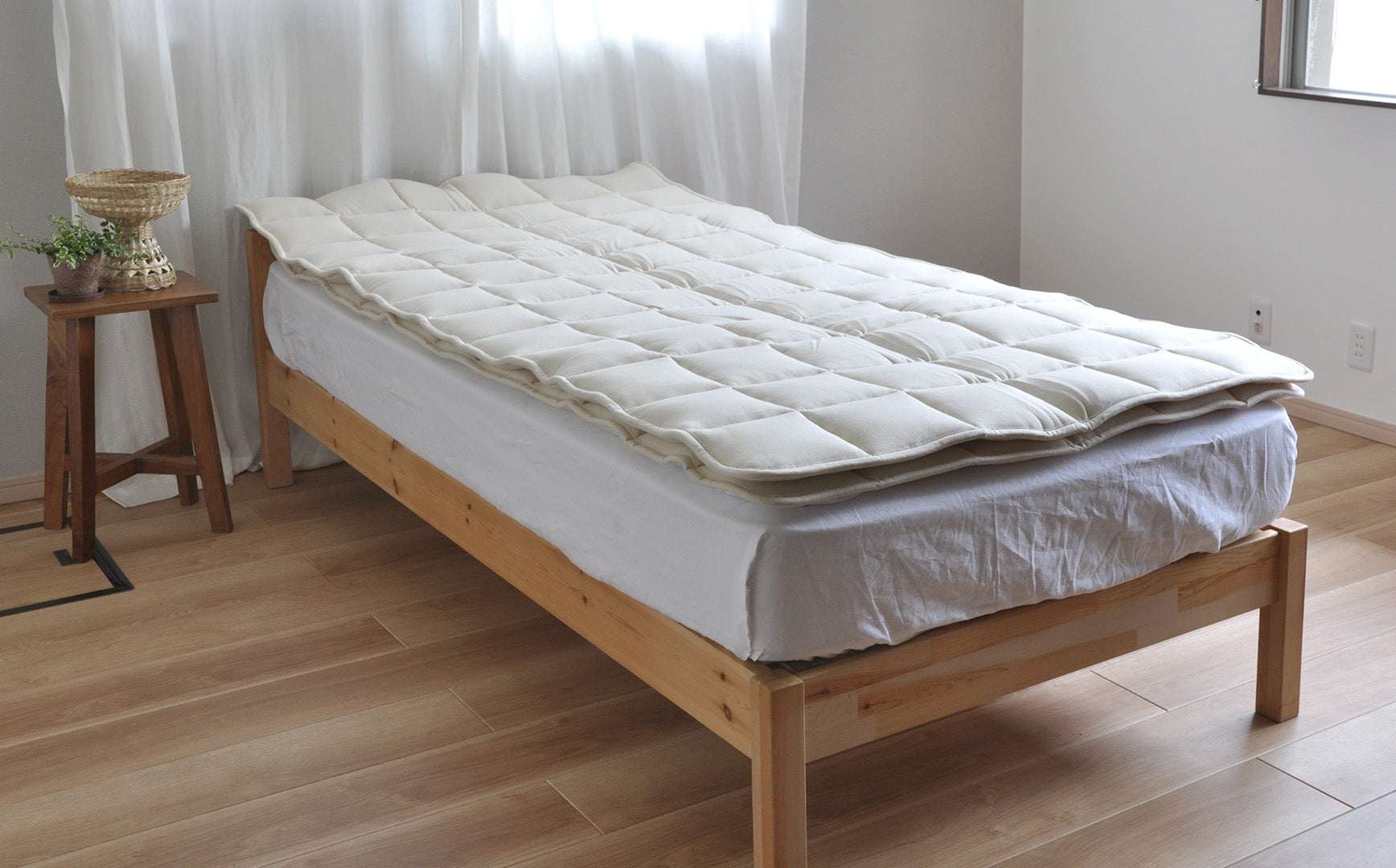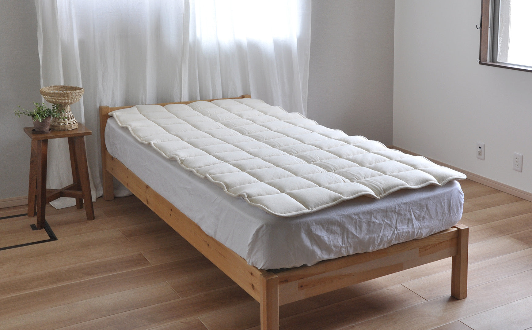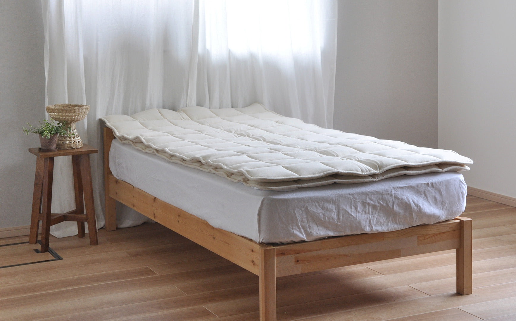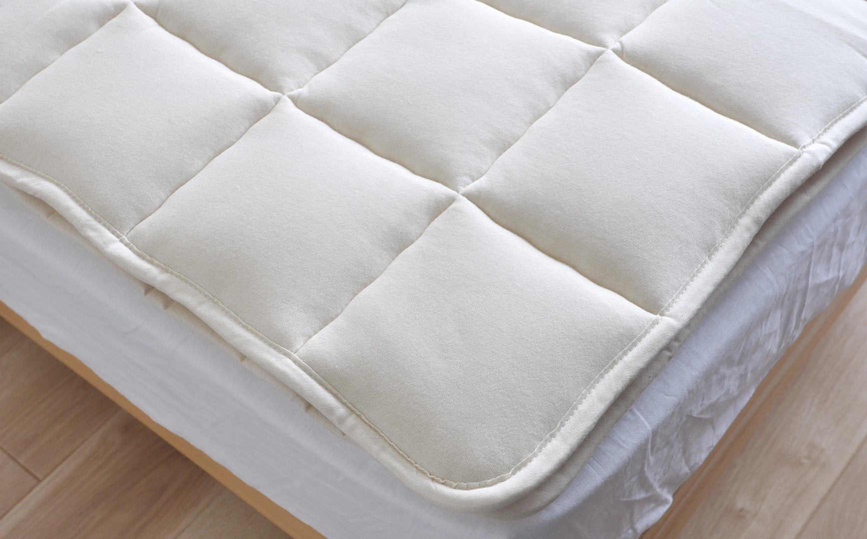 ウールのベッドパッドは体重が一部に偏らないよう、身体と密着し吸収することで寝心地をアップさせてくれる役割。