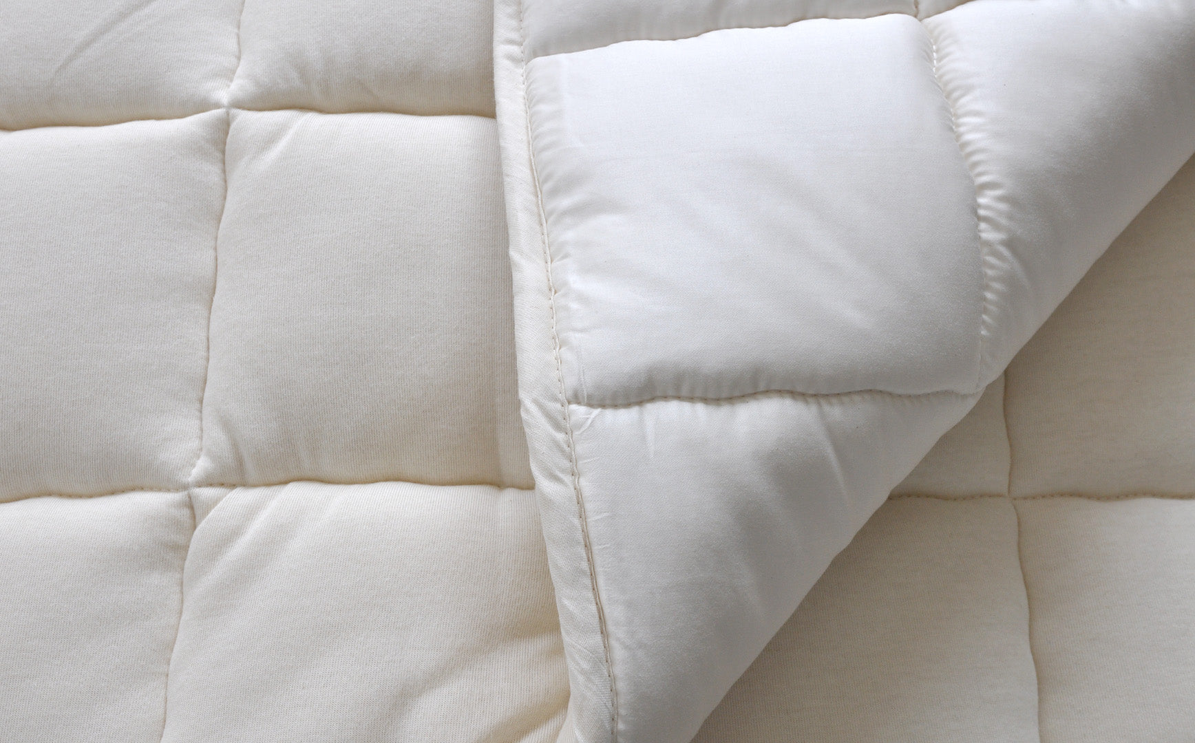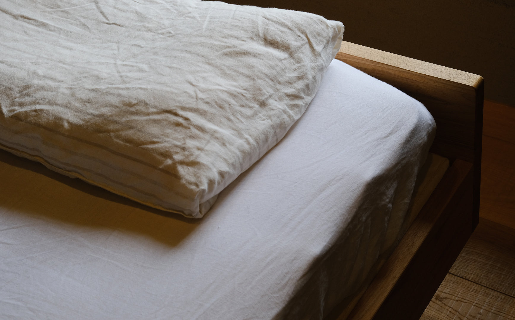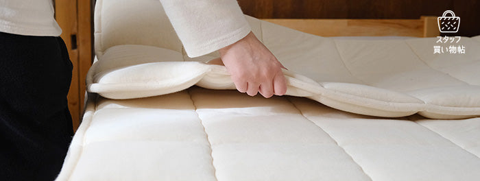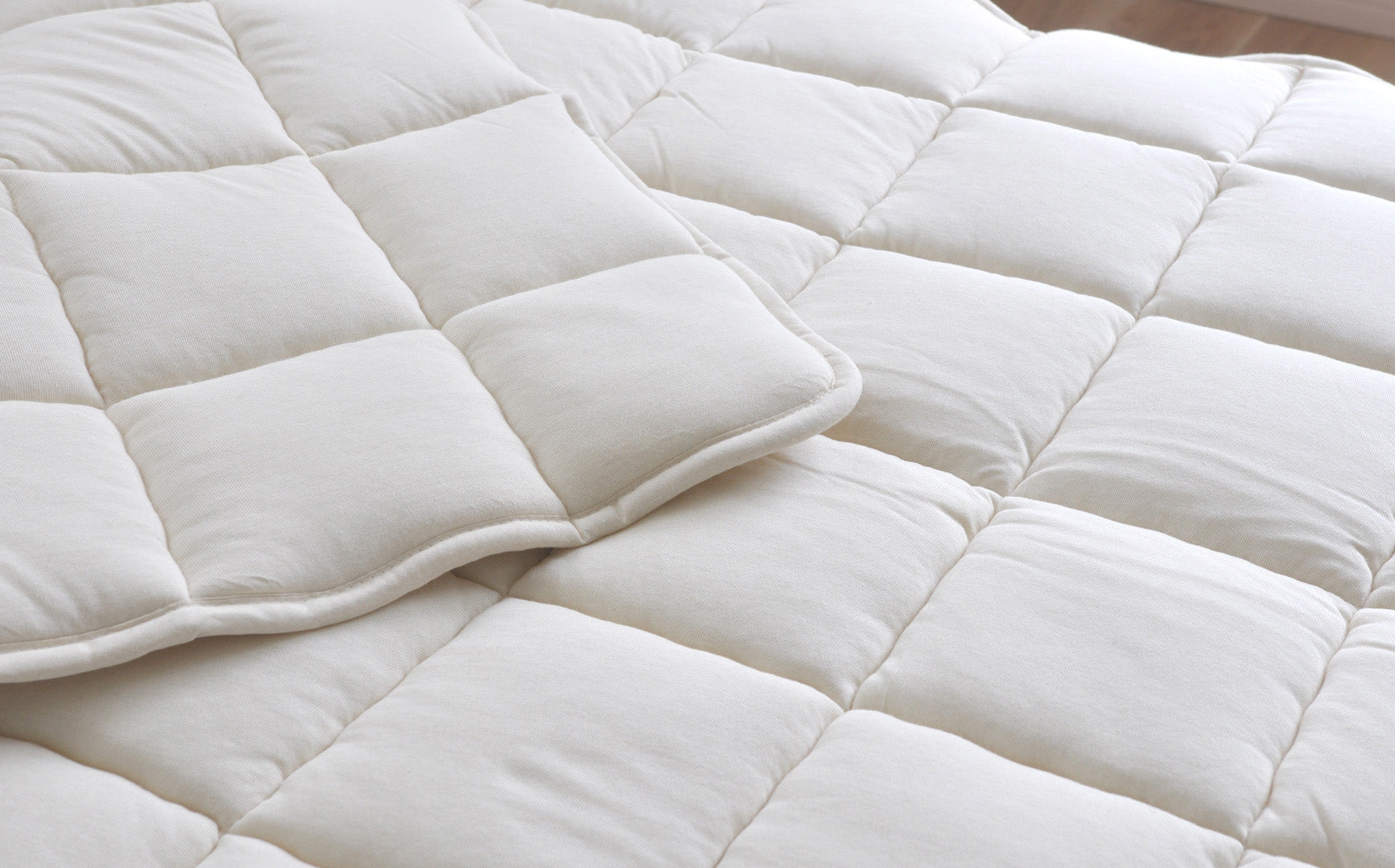 ウールのベッドパッドは体重が一部に偏らないよう、身体と密着し吸収することで寝心地をアップさせてくれる役割。