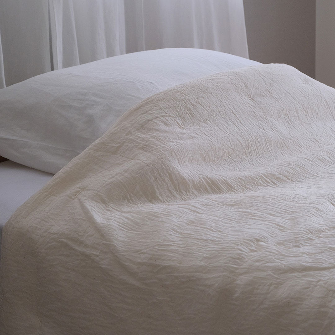 お餅のようにぽってりとしたシルク布団の側生地はコットンのガーゼ織り。肌触りもやわらかくシルクナチュラルな見た目や柔らかい印象。
