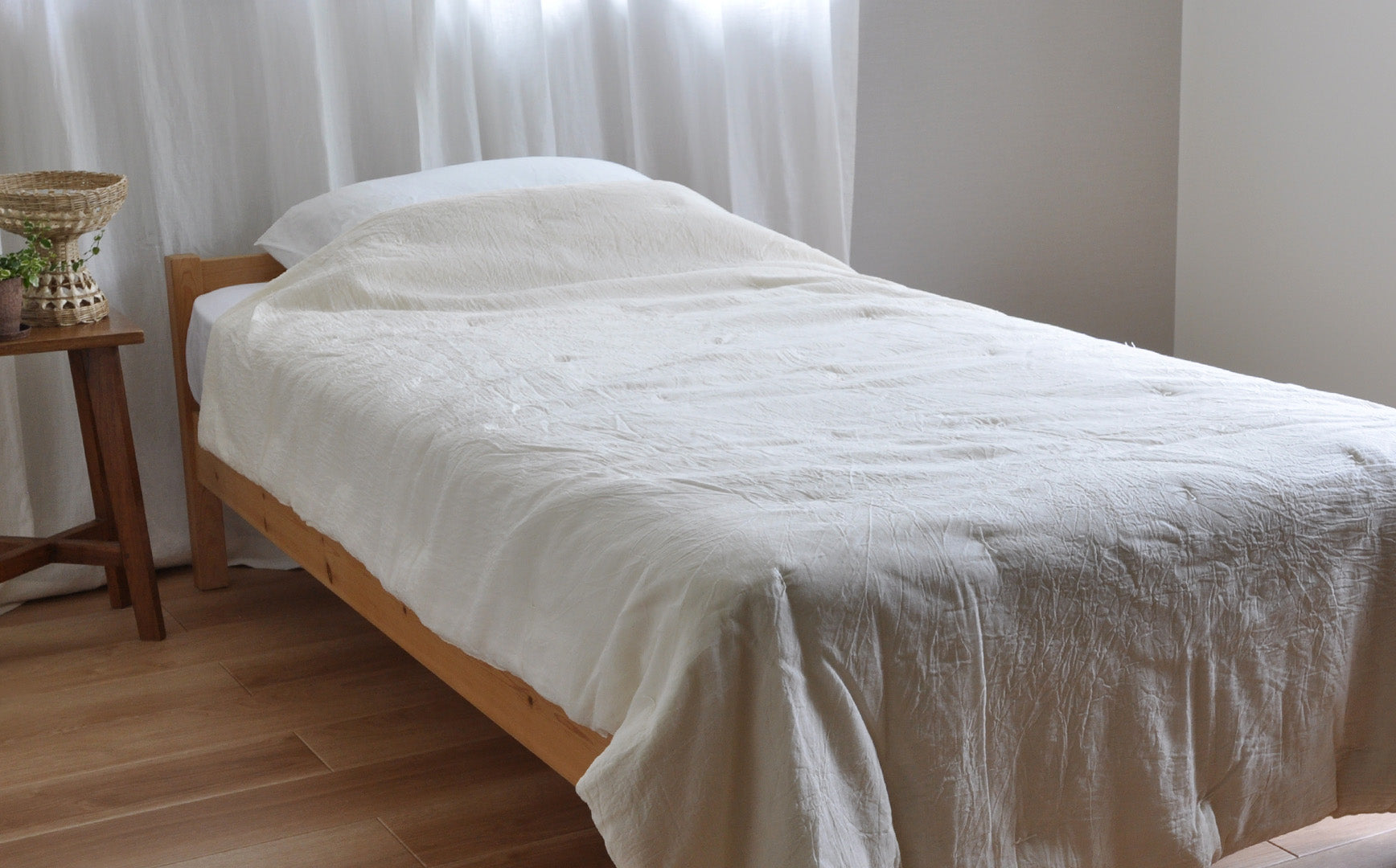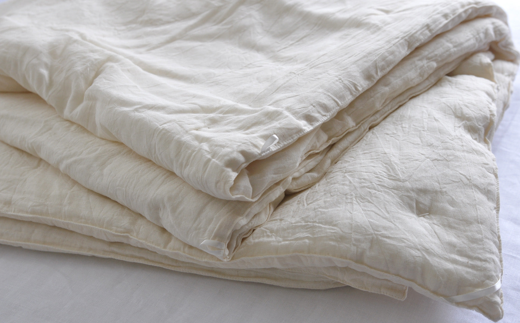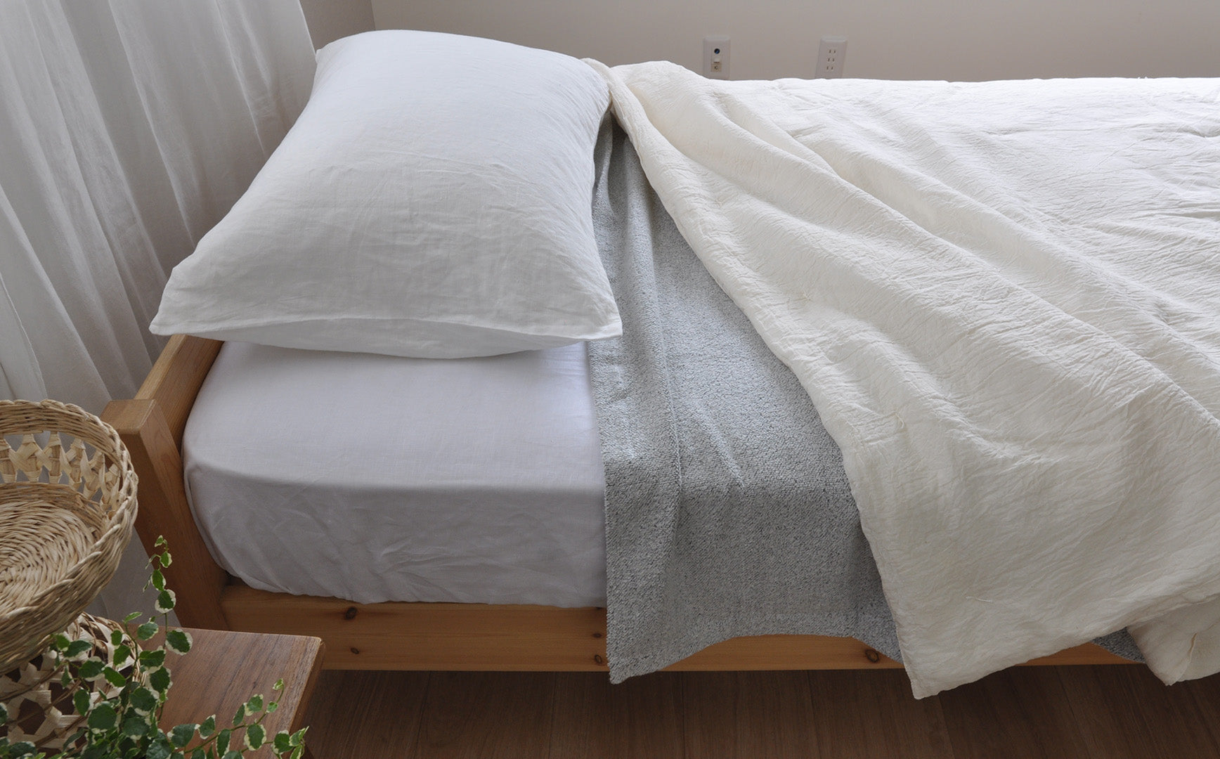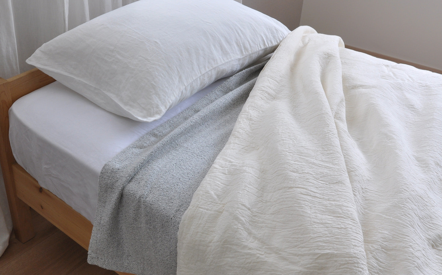 ▲秋口はリネンパイルケットと真綿肌掛け布団の組み合わせもおすすめです