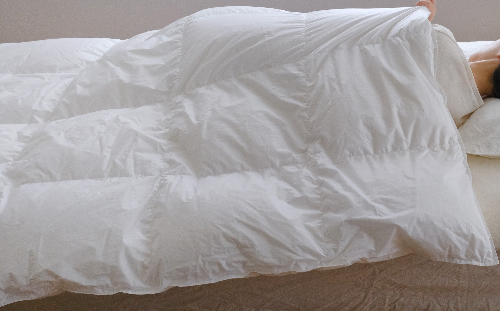 ひとつの粒が大きく、ダウンパワーが高い=保温力が高いため、布団をかけるとすぐに身体の熱を移して手足がぽかぽかとあたたまります。ここちよいあたたかさをキープできるため、ムレることもありません。