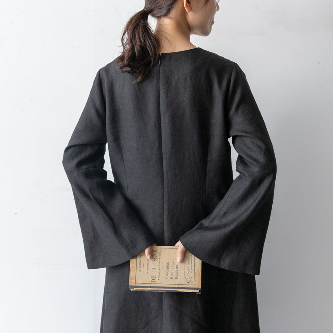 ベルのようなフレアした袖と細身のシルエットが美しい上品なワンピース。普段使いから、ちょっとしたお呼ばれの席まで幅広く着こなせます。控えめな光沢の黒色のリネン地は華やかなアクセサリーをより引き立たせます。ウールリネンの「アマリア / ノアール・シャルボン」もございます。