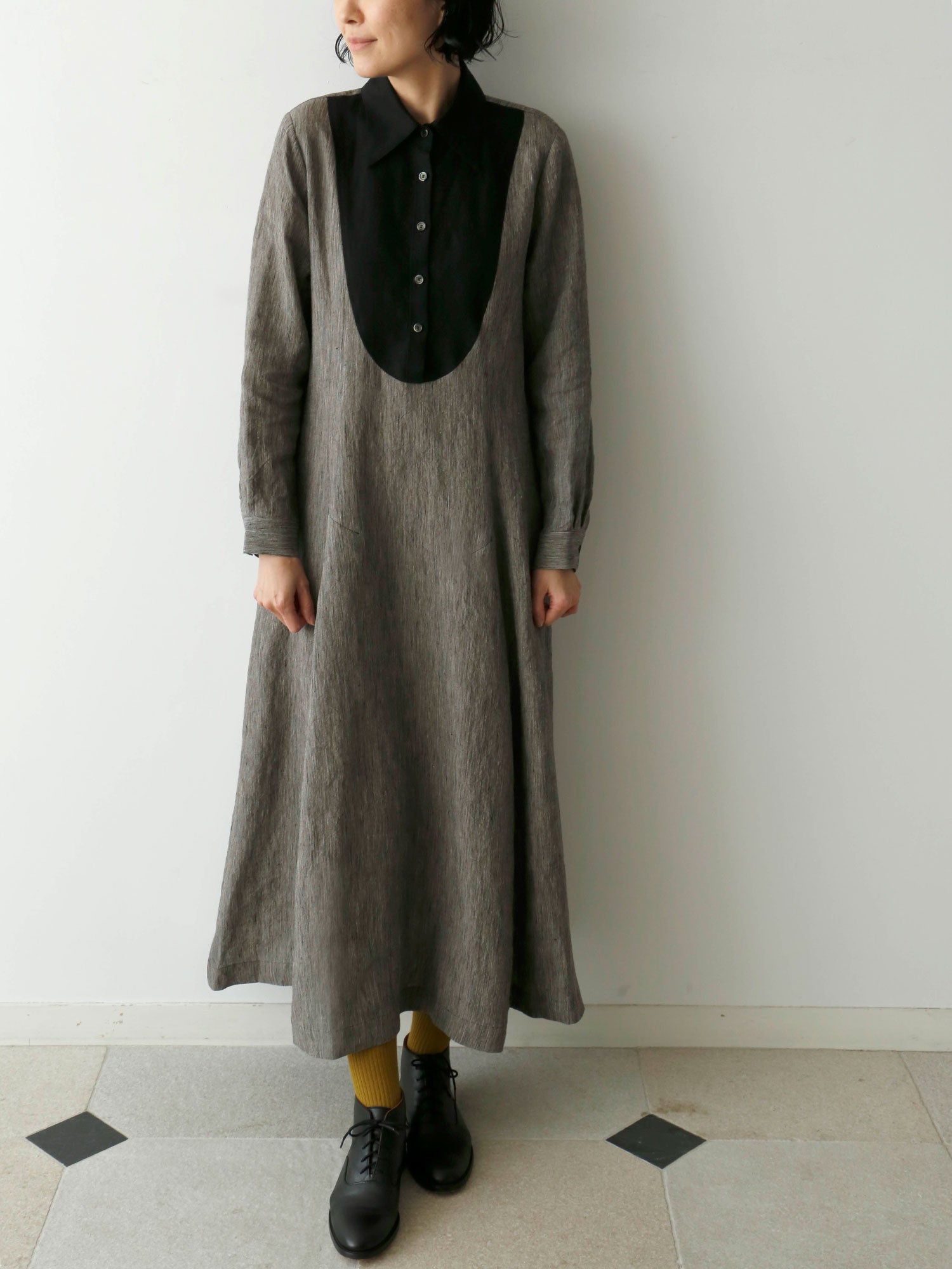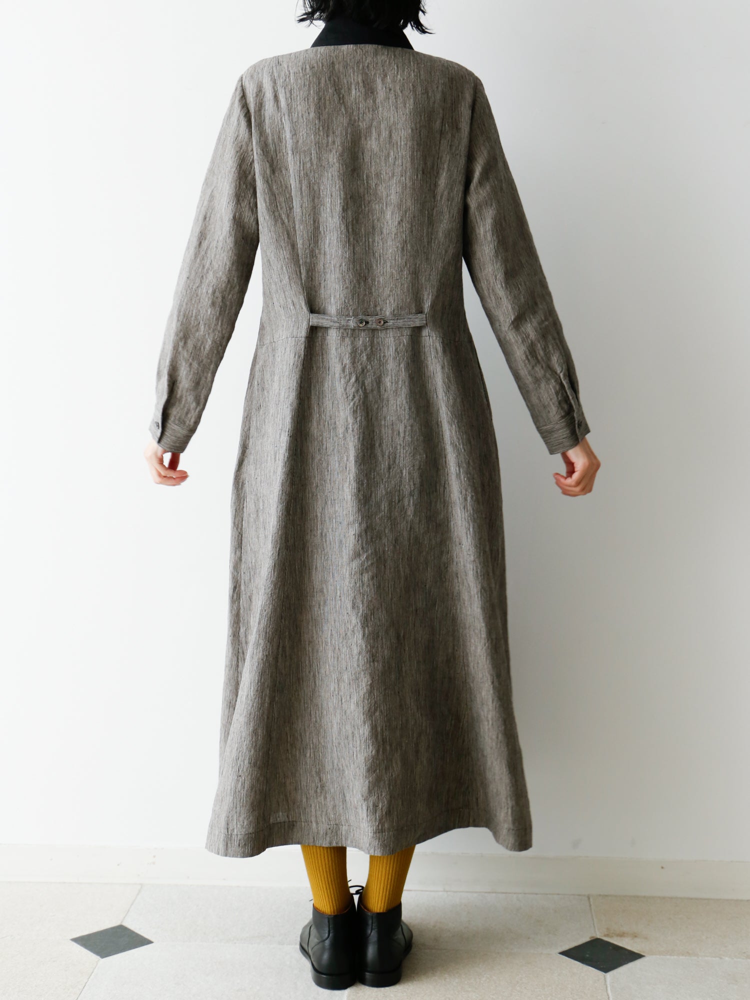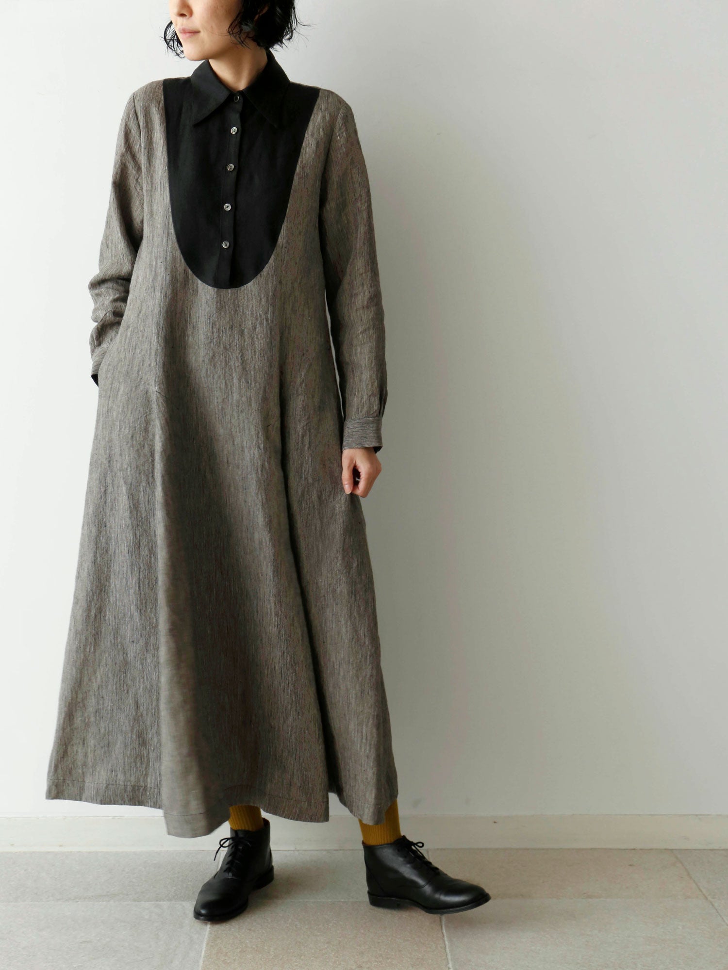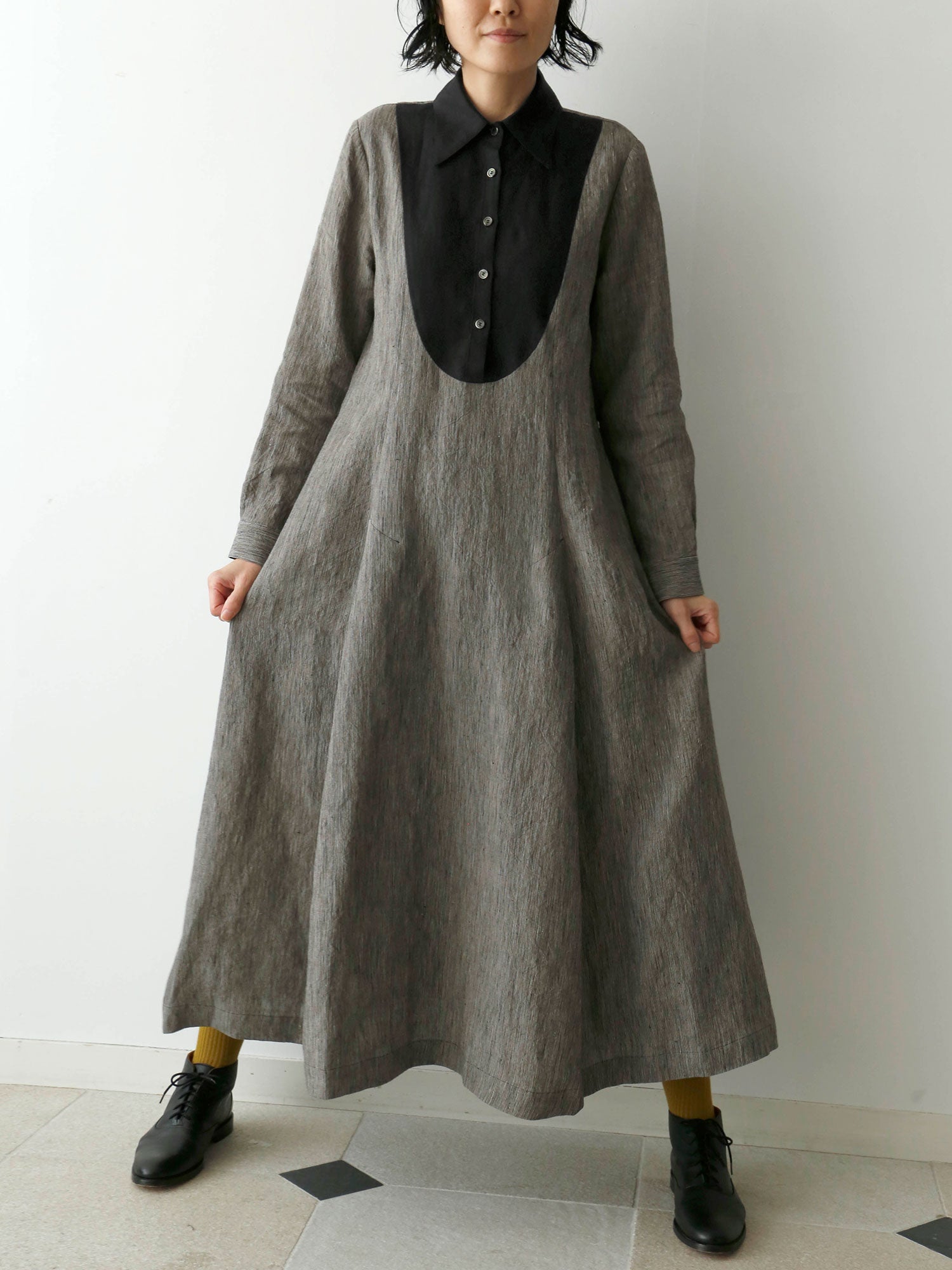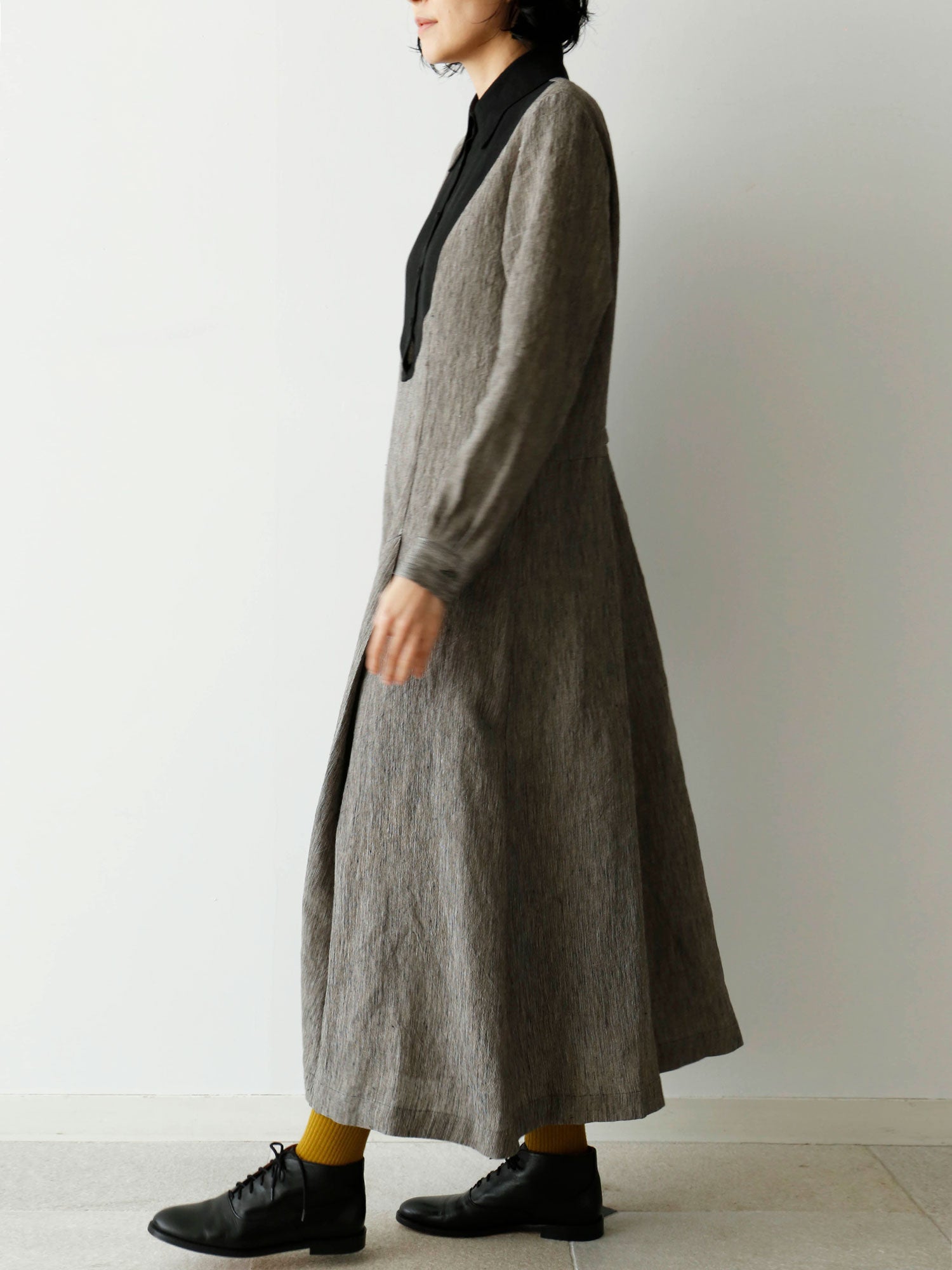 アイリッシュリネンで仕立てた襟付きのワンピース。繊細に織られたストライプと、黒いリネンの組み合わせがクラシカルで上品です。一枚で着てお出かけにも、すっきりとしたラインで重ね着にも重宝する一枚です。