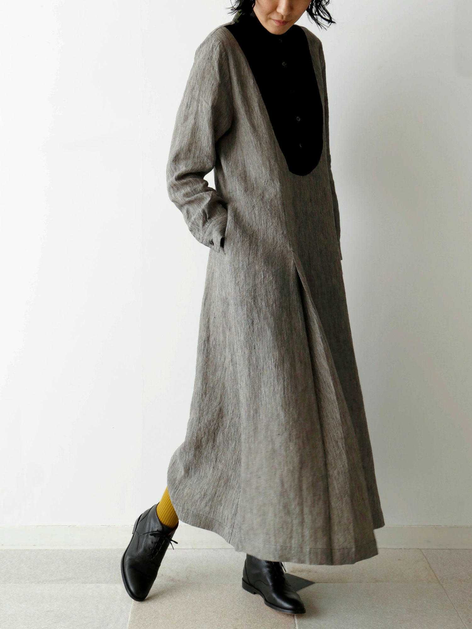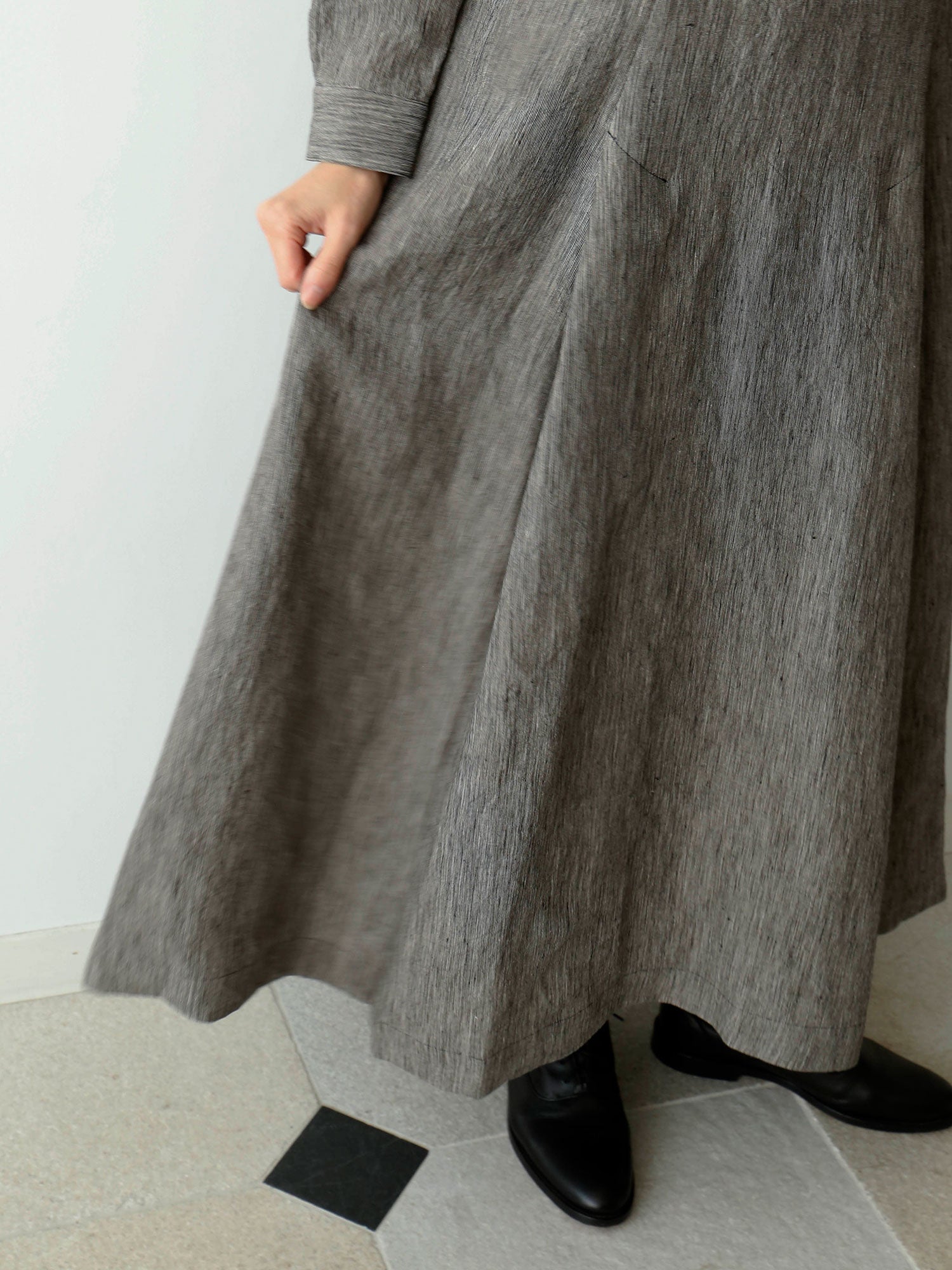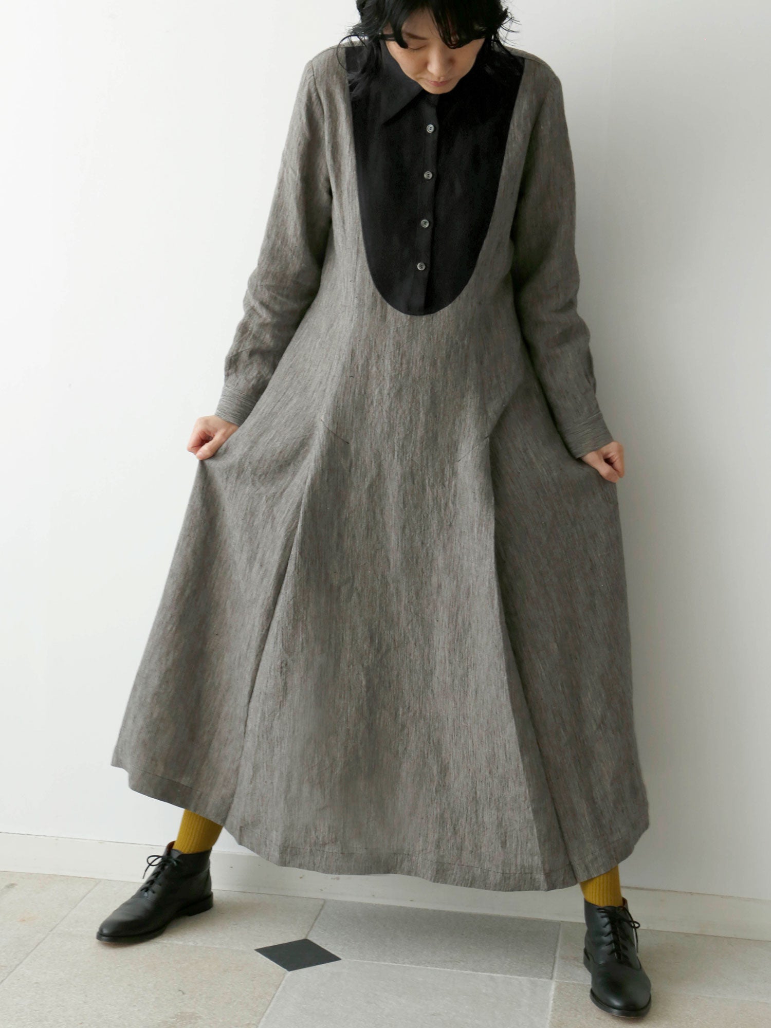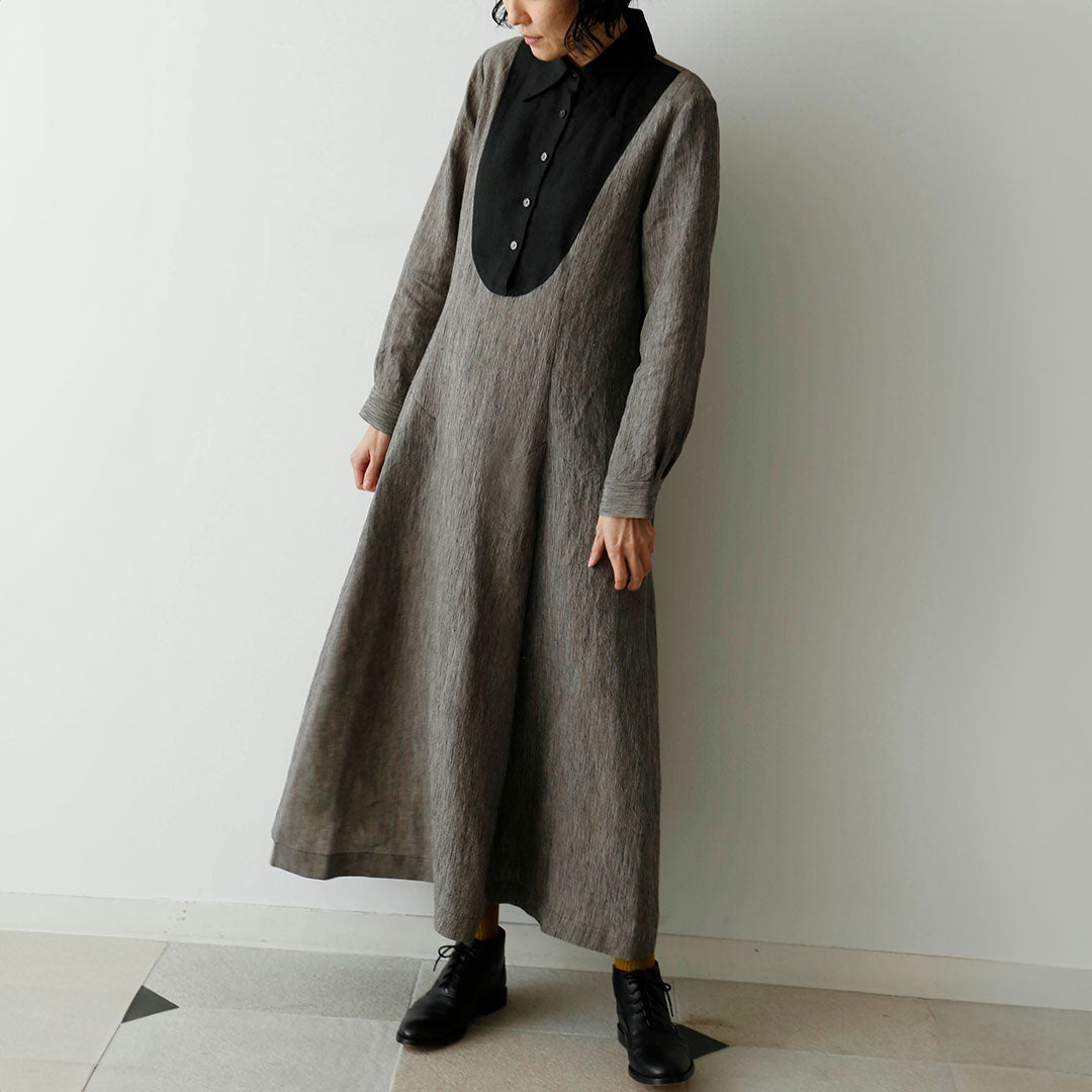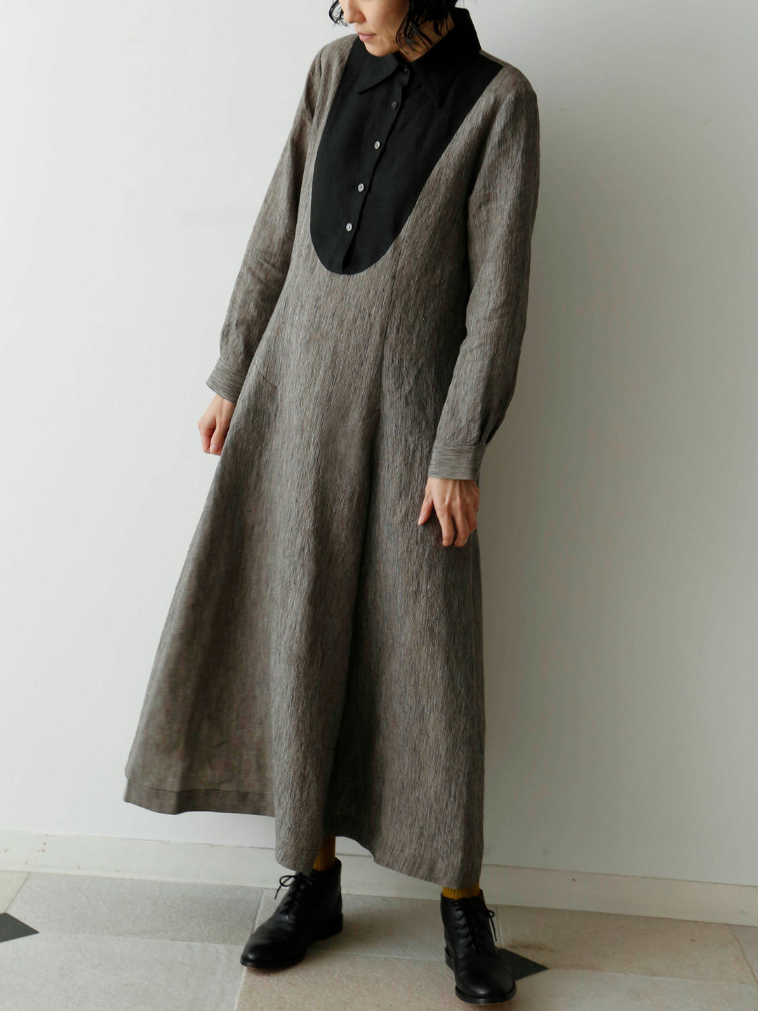アイリッシュリネンで仕立てた襟付きのワンピース。繊細に織られたストライプと、黒いリネンの組み合わせがクラシカルで上品です。一枚で着てお出かけにも、すっきりとしたラインで重ね着にも重宝する一枚です。