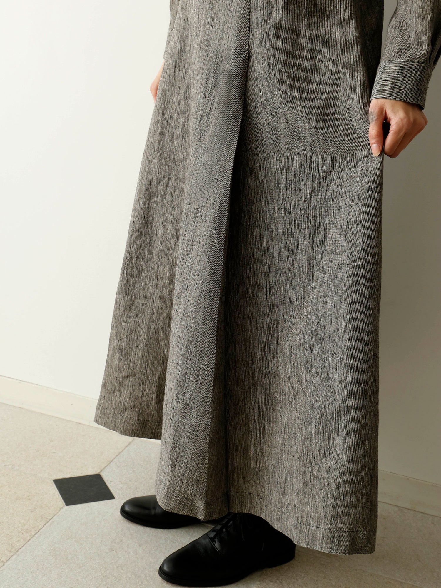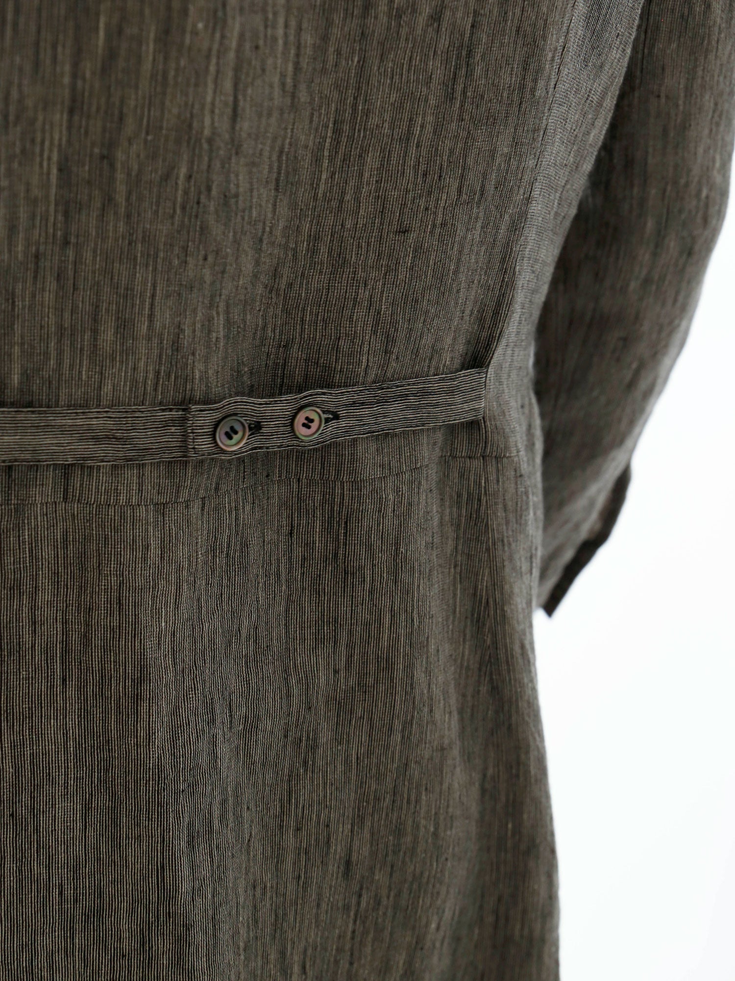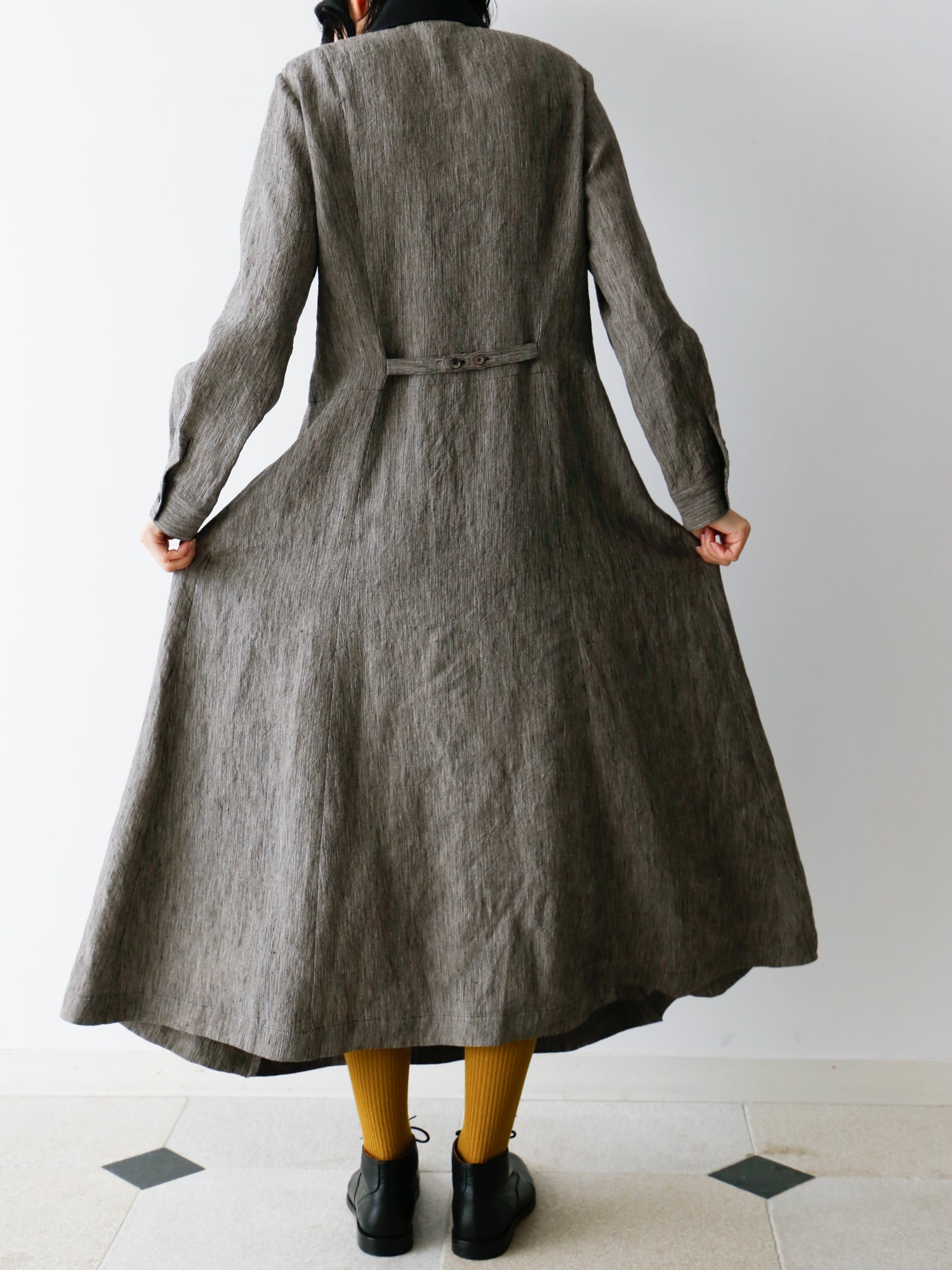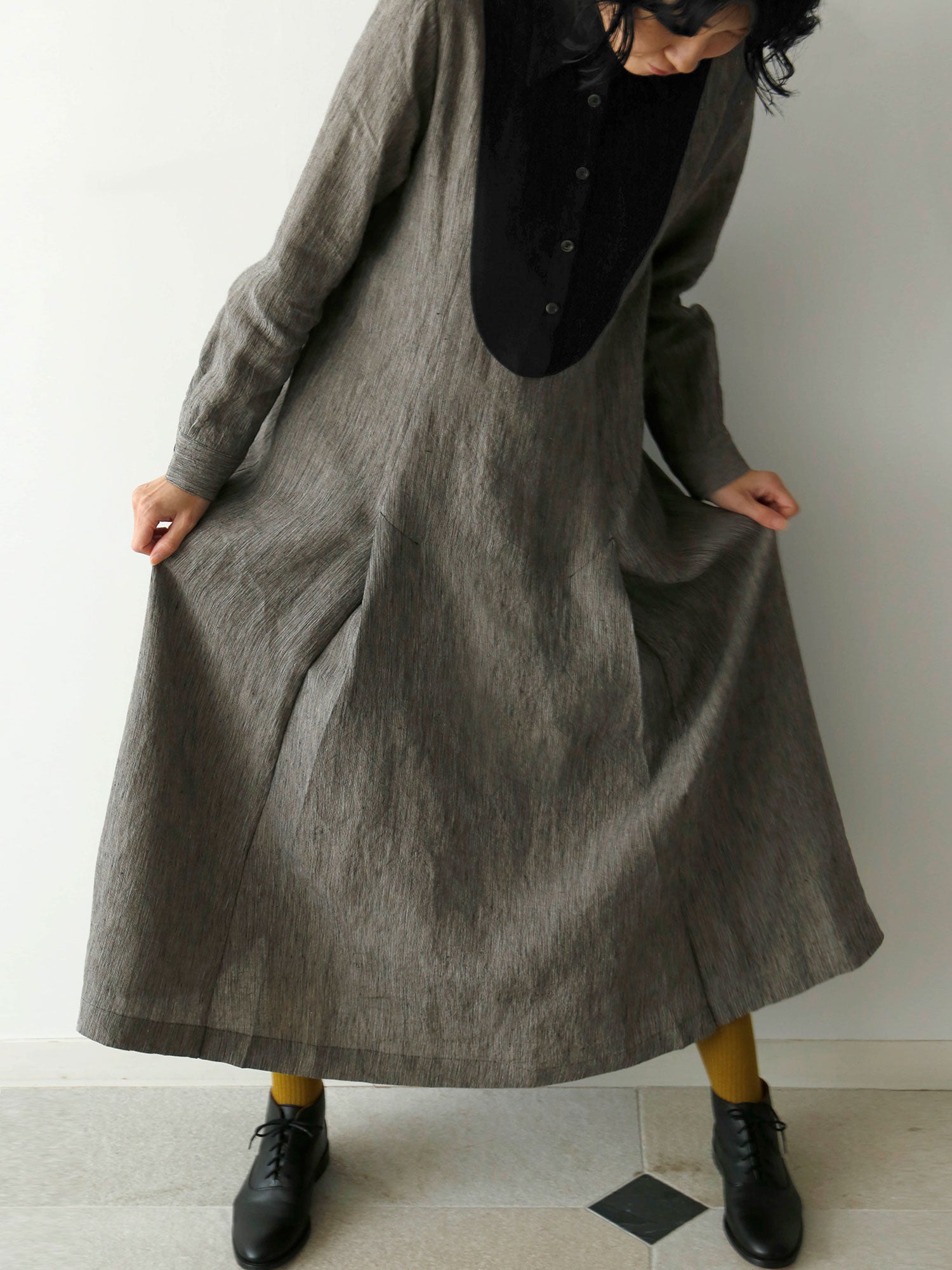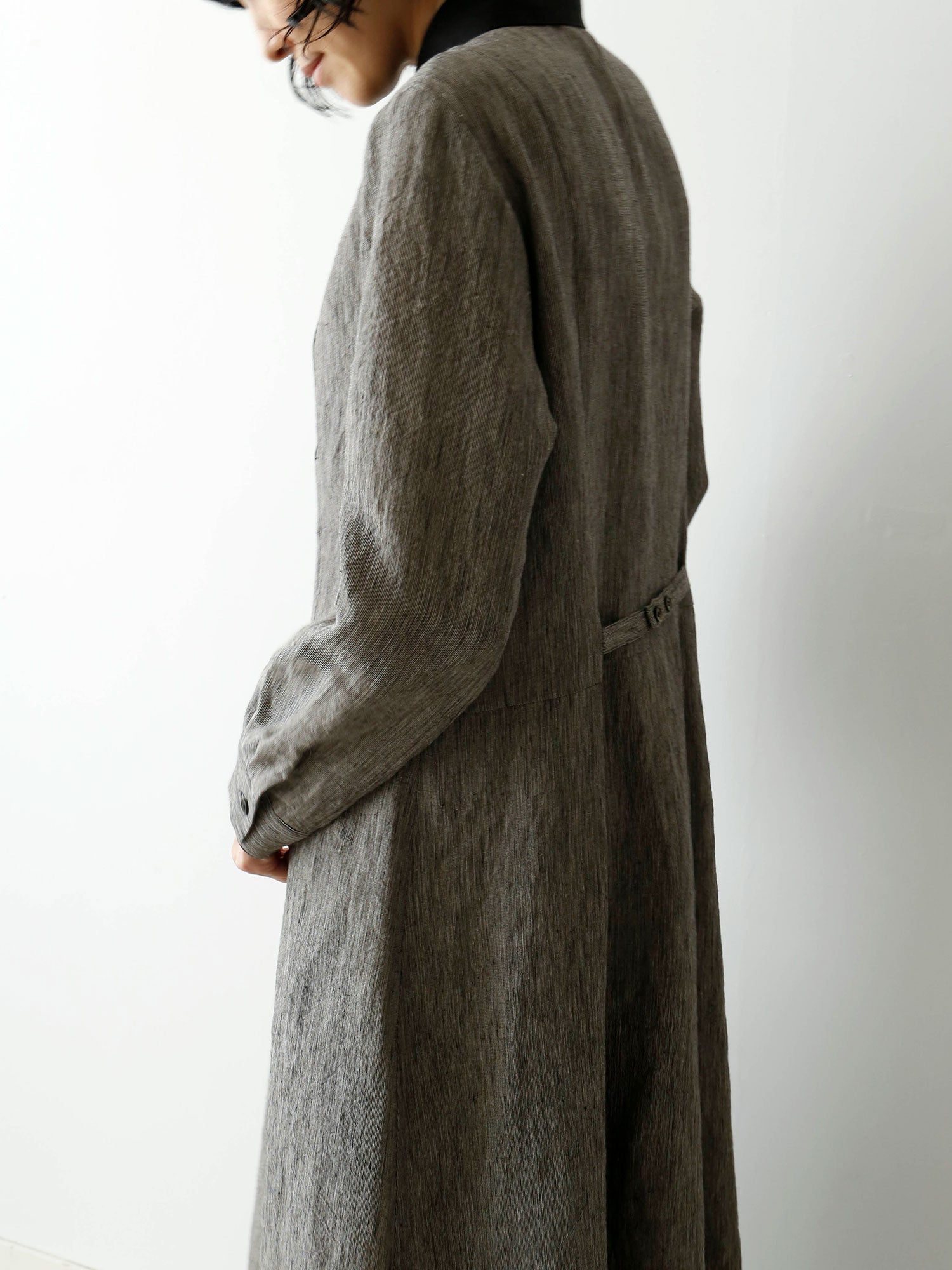 アイリッシュリネンで仕立てた襟付きのワンピース。繊細に織られたストライプと、黒いリネンの組み合わせがクラシカルで上品です。一枚で着てお出かけにも、すっきりとしたラインで重ね着にも重宝する一枚です。