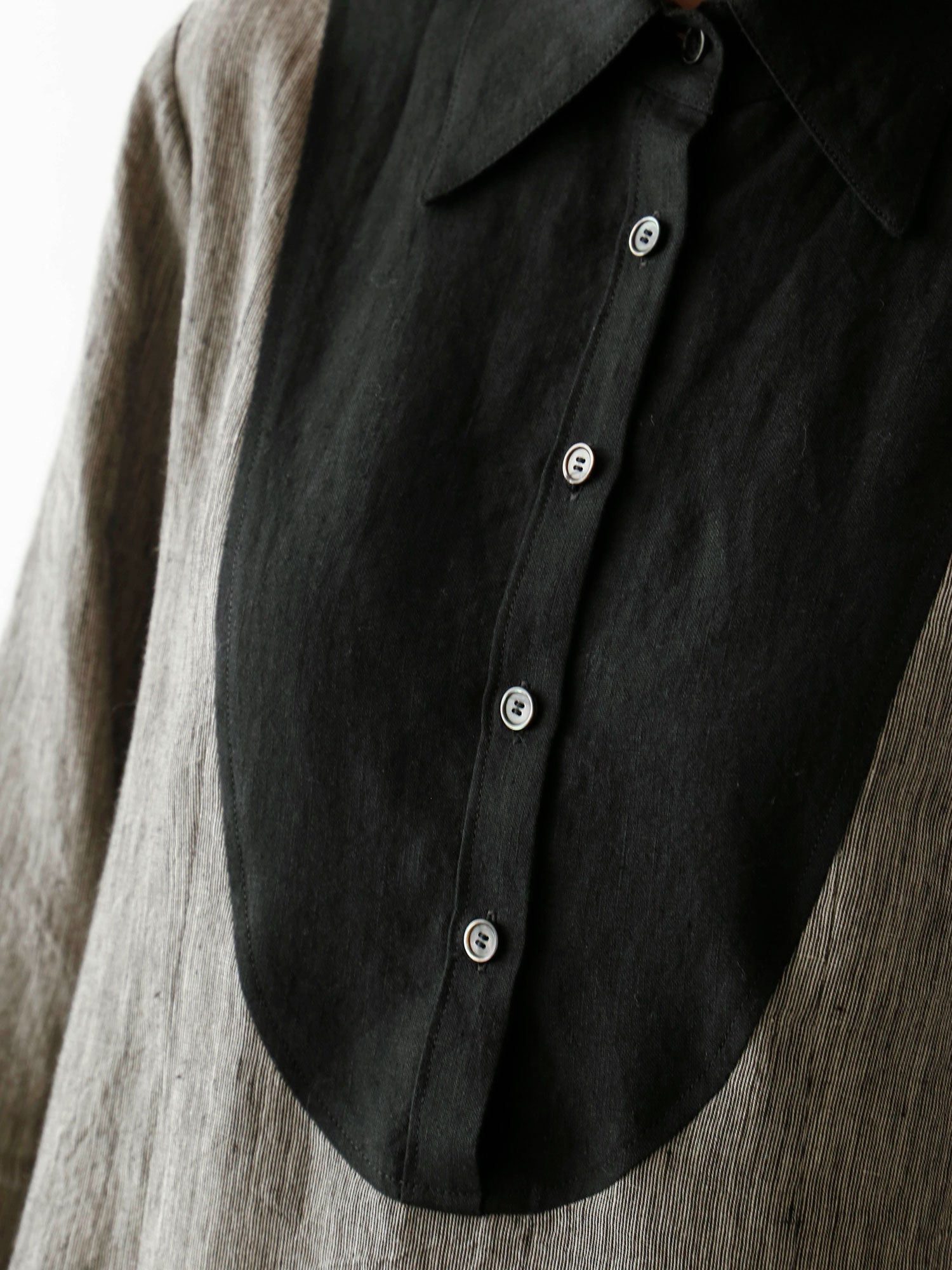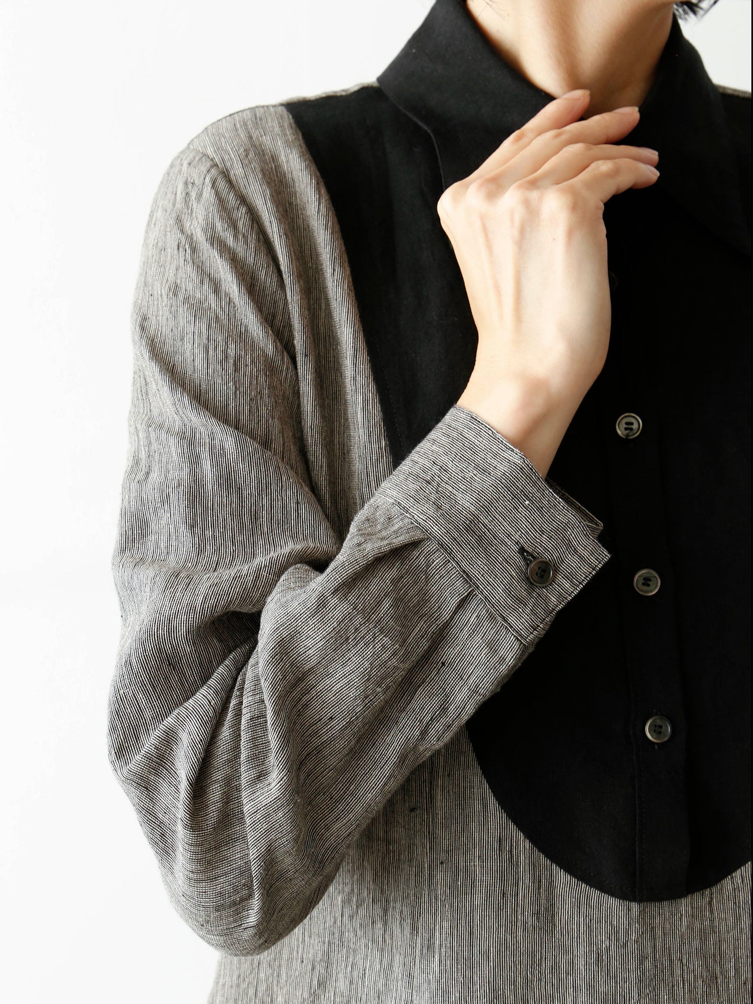台襟の付いた立体的な襟と、なだらかな曲線を描くヨークの組み合わせがアクセント。繊細なストライプと、黒いヨーク切り替えのコントラストが印象的なデザインです。