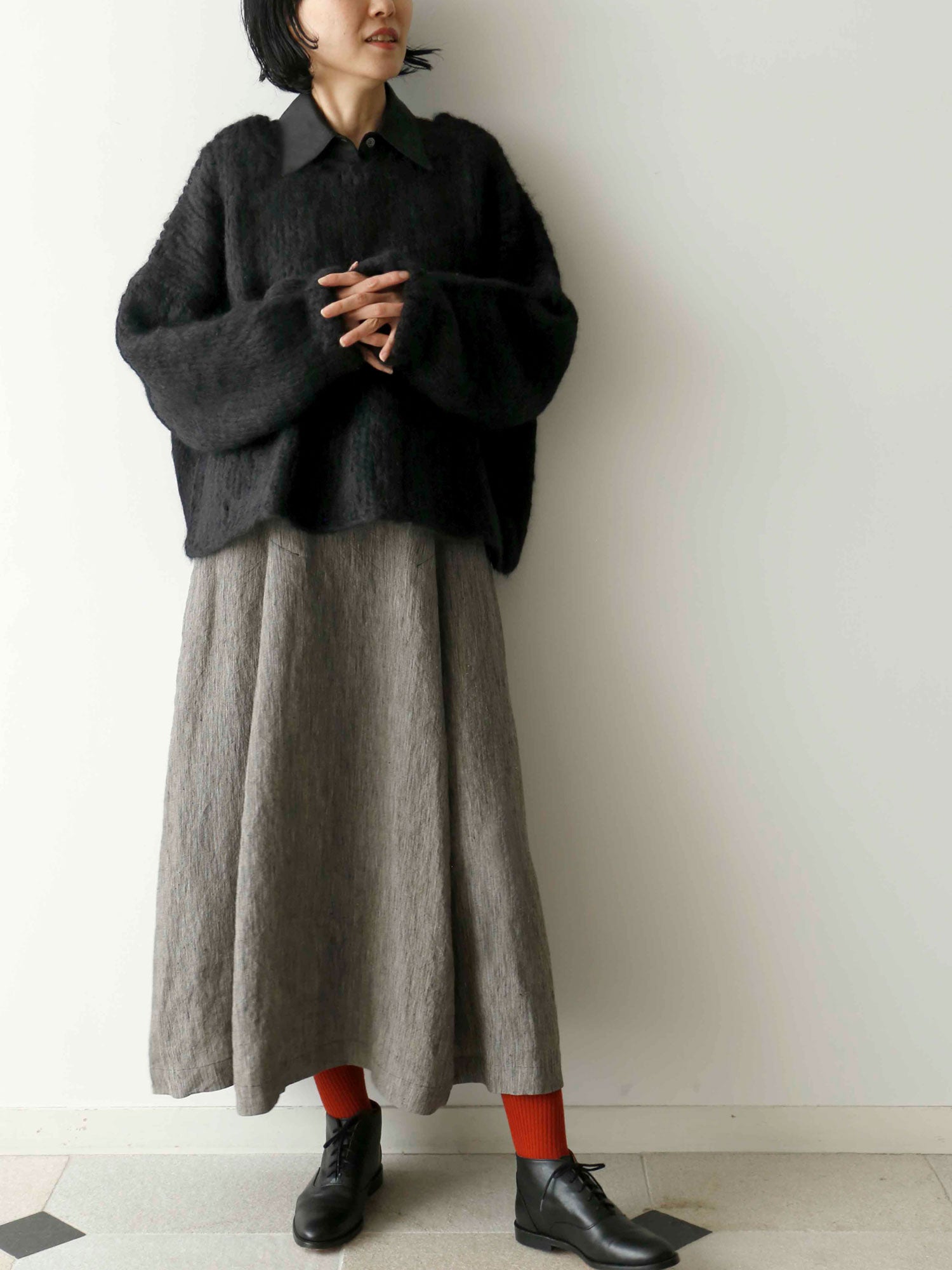 黒いニットを羽織ったコーディネート。大人っぽく少しモードな印象に。