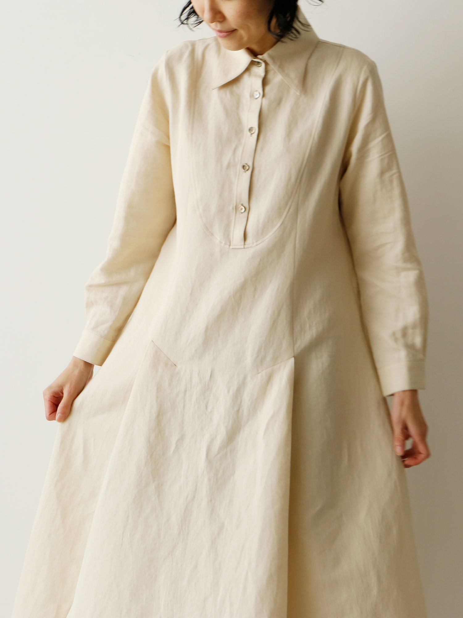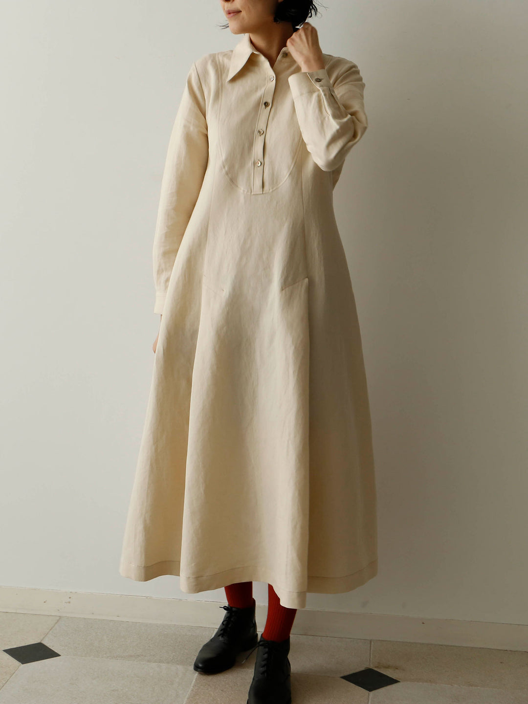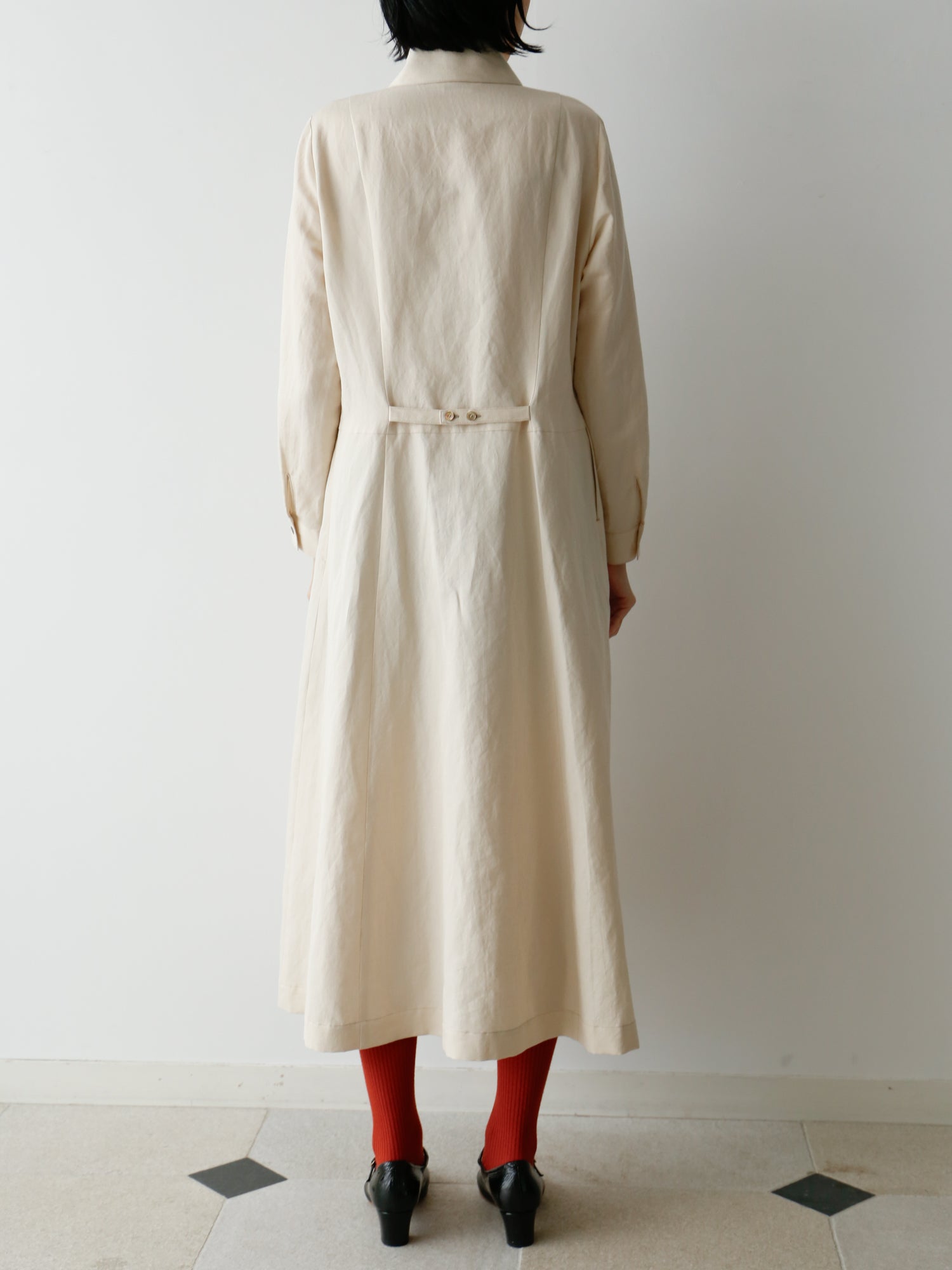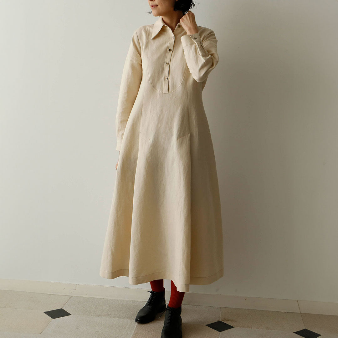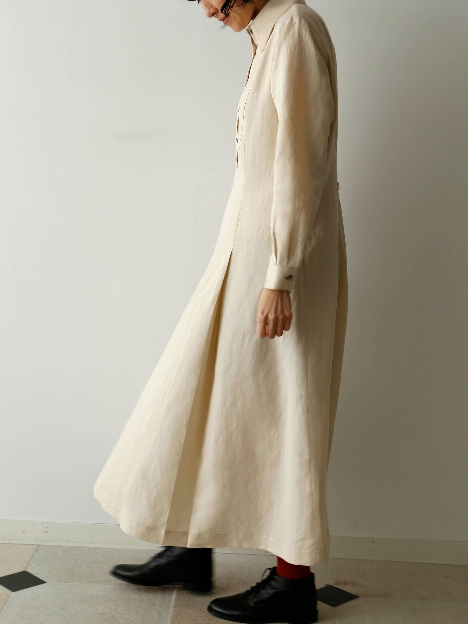 やわらかく優しい色合いの、リネンコットンで仕立てた襟付のワンピース。上半身は細見えを叶えるすっきりとしたライン。スカート部分はタックプリーツをとることで、たっぷりと優雅に広がります。これかの季節のお出かけにちょうどいいワンピースです。